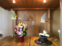 鶴を飾りつけ、鹿威しに模した水の流れるミニ噴水を配置。