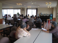 平成27年6月28日(日)13時より9階ラウンジにて家族会を開催しました。今回も25名の方にご参加いただき、家族会常連の方も新しくご入居されたご家族も楽しく団らんされていました。その中で、生活相談員の田中幸子が家庭の事情により急遽、遠方に行かなくてはならないことを発表しましたが、担当している手芸クラブは月2回継続していくことをお伝えすると、安堵の声がもれてきました。はぴねのマダムでもあり顔でもあった田中がこれだけ皆さんに慕っていただいていることは施設として本当に嬉しいことです。今後は、5階のフロアリーダー、荻野寛が生活相談員として就任します。これからもはぴねを創り上げている一員として、田中にも関わってもらいながら、スタッフ皆でますます頑張って行く所存ですので、これからもご支援いただきますよう、よろしくお願い致します。