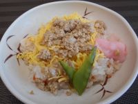 「そぼろちらし寿司」「里芋の煮物」「筍の梅和え」「味噌汁」です。
