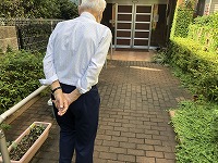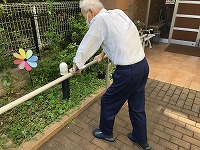 玄関前のリハビリロードの手すりを使って、