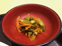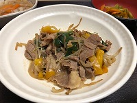 牛肉の甘辛炒めは、もやしとにら、黄色パプリカが