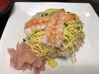 丸くかたどられたお寿司の上にエビがクロスしています。