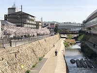 美しい川の流れに、ソメイヨシノの淡い桃色がトッピング。