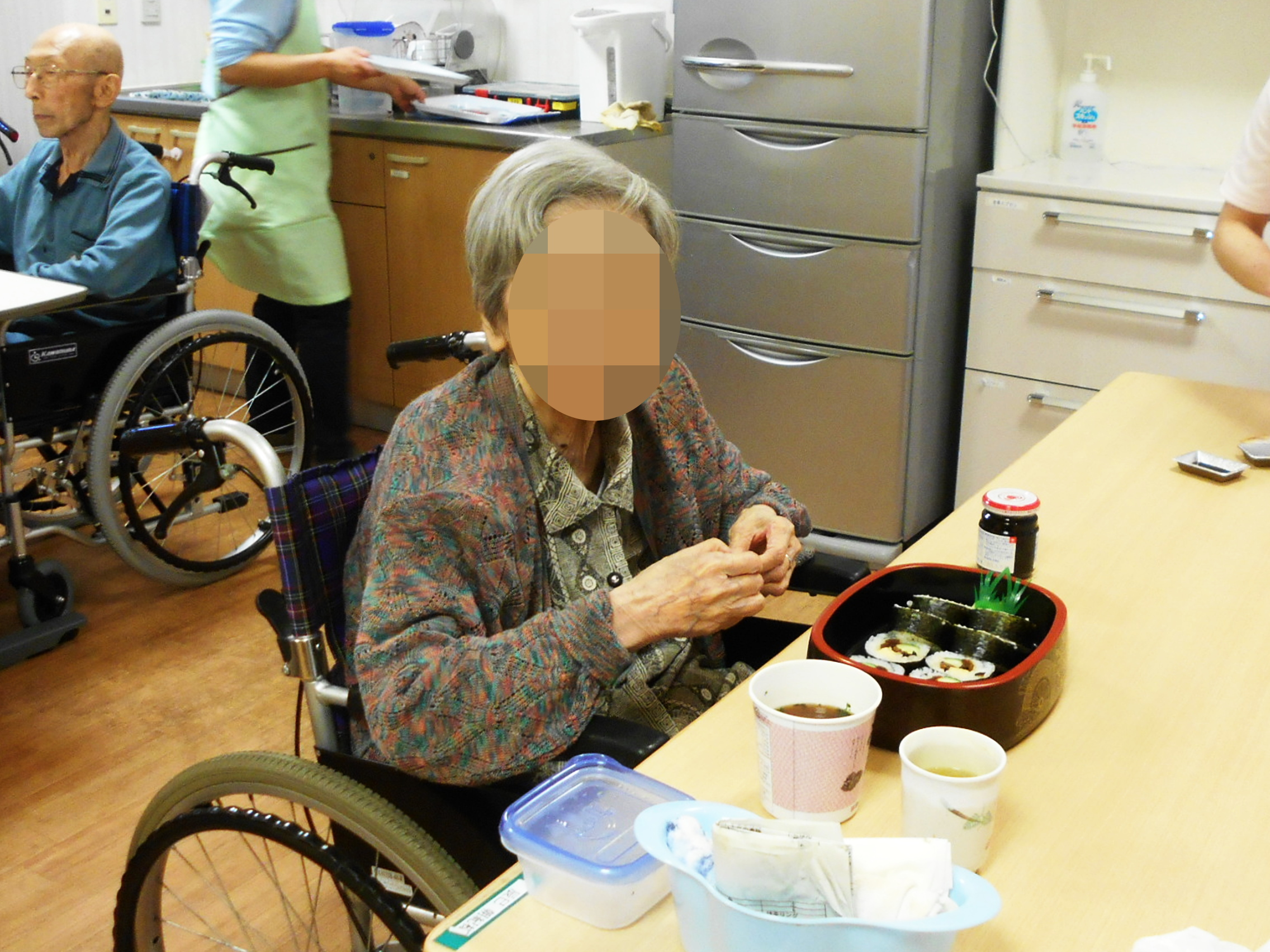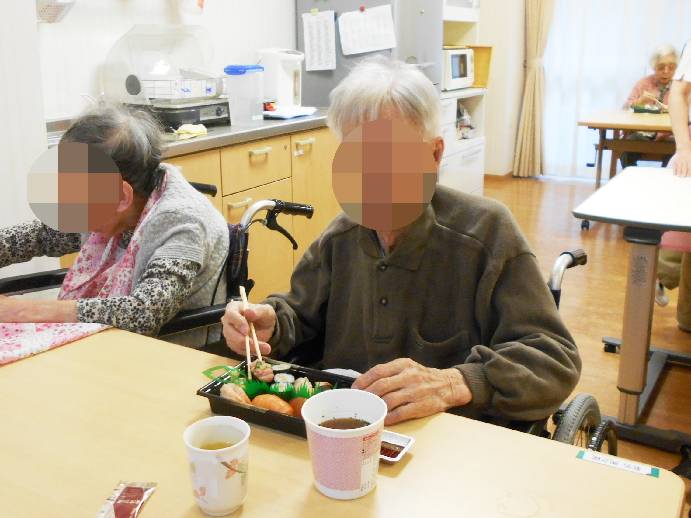 日頃より「お寿司が食べたい!」と沢山の方よりご要望を頂いていましたが、委託しております厨房会社では生ものの提供が難しく、今回はお寿司のデリバリーを利用し、召し上がって頂きました。