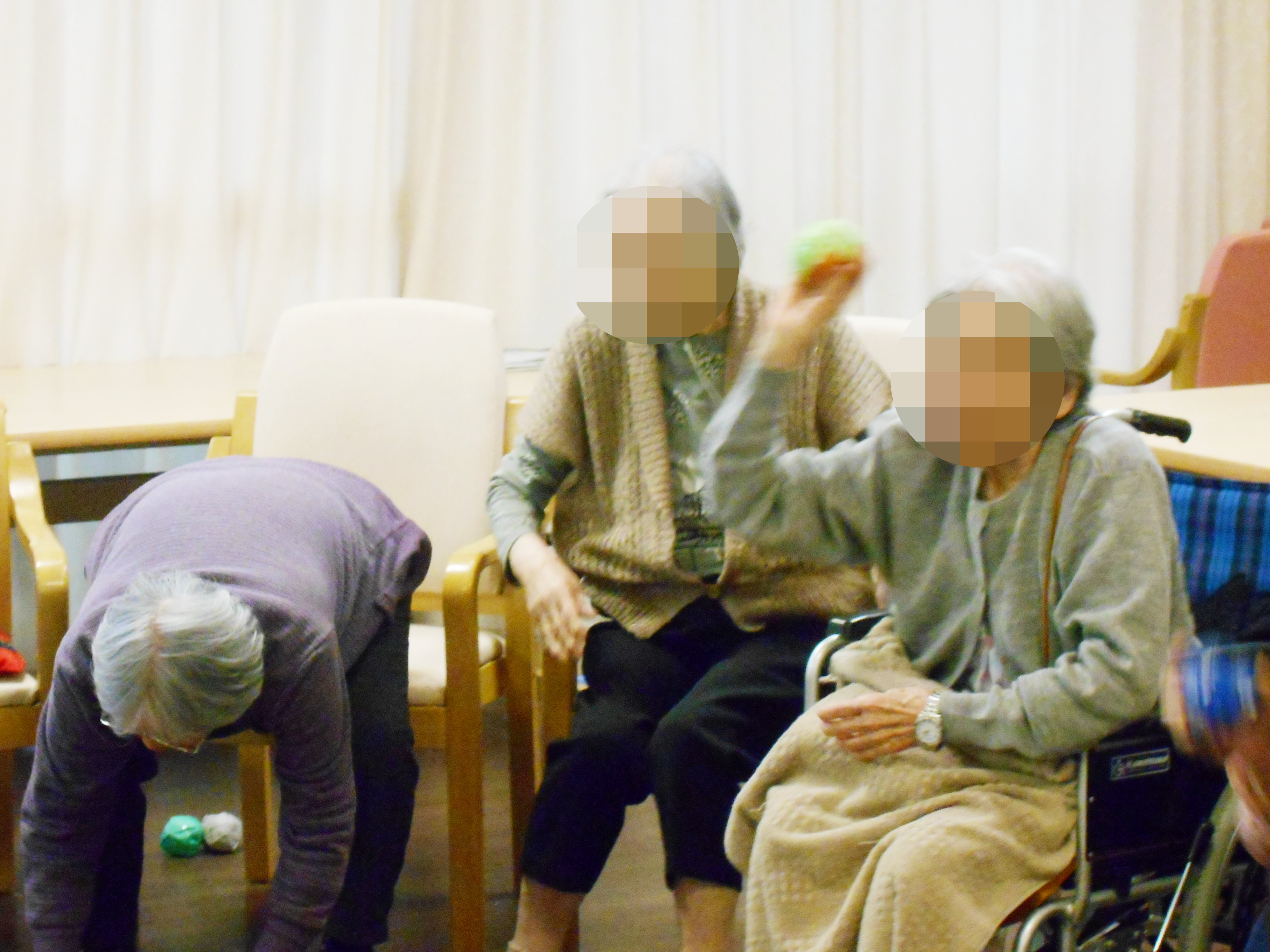 鬼が来たら(豆の代わりの)ボールを投げてくださいね、という説明に「これぶつけていいの?」「痛くない?大丈夫?」と優しさ溢れる言葉を仰っていた入居者様方ですが、鬼の登場にテンションアップ!先程の言葉はどこへやら(笑)力一杯、ボールを投げ鬼退治をされていました。