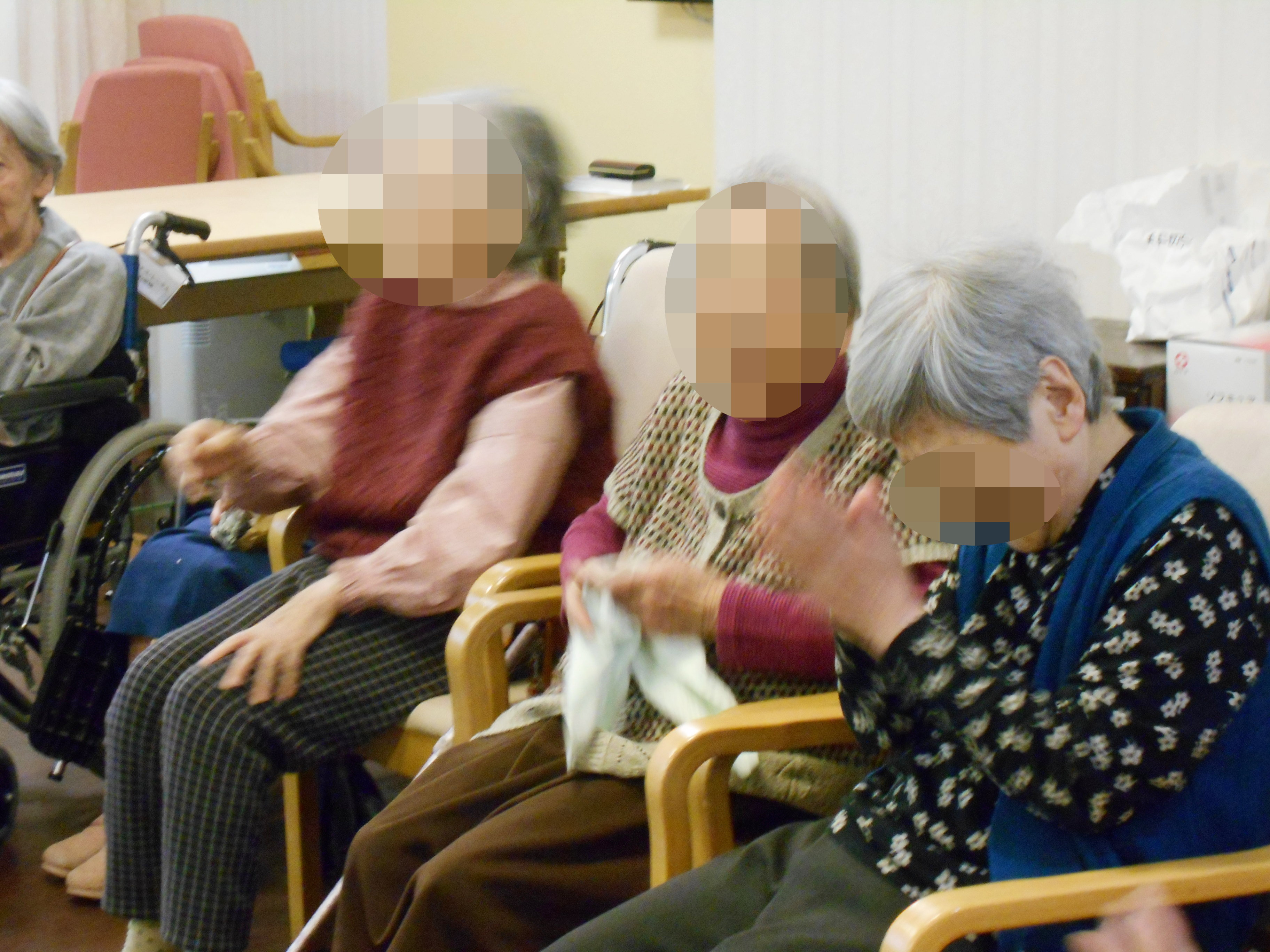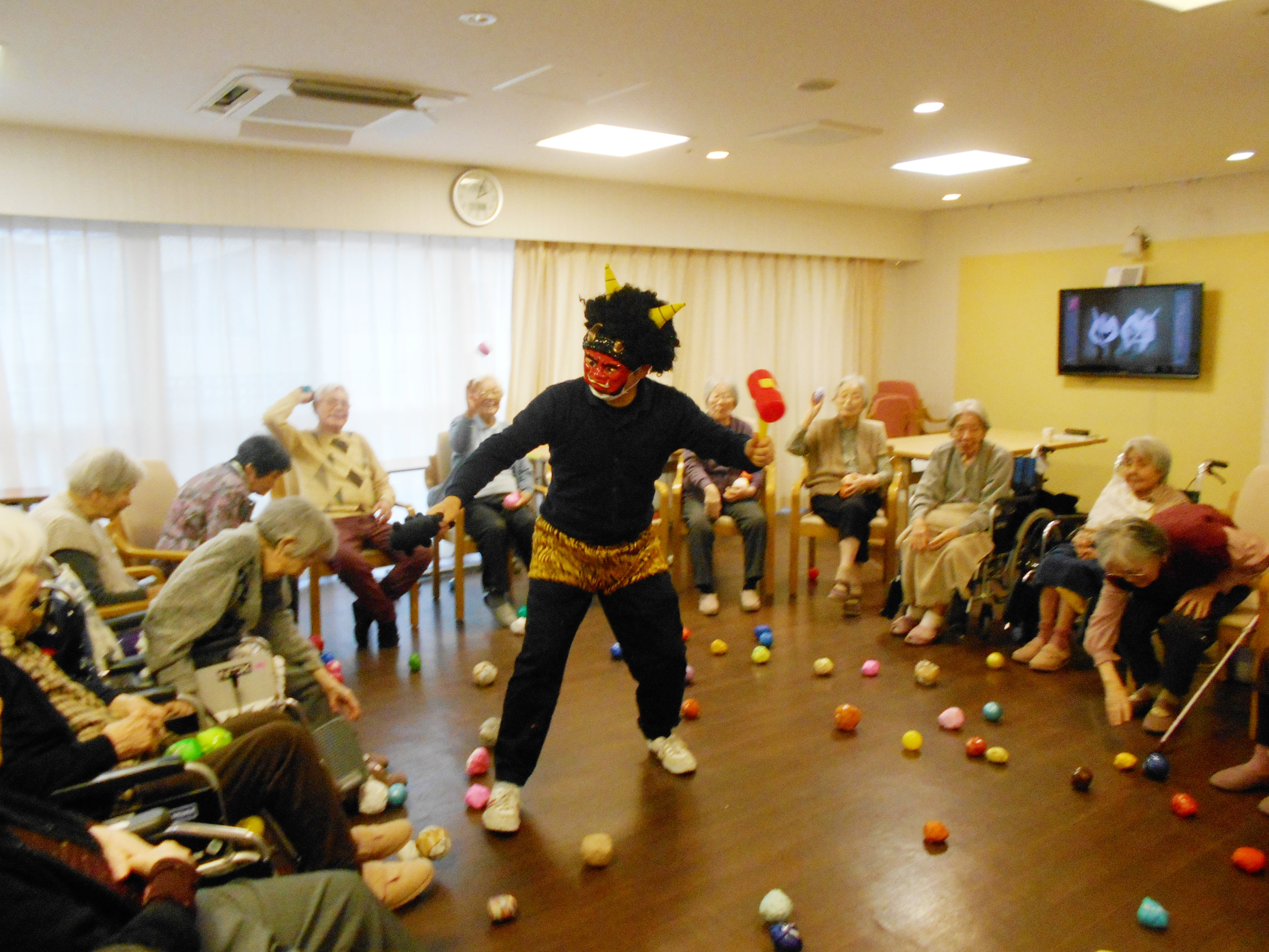 2月3日に「節分」レクをおこないました。毎年各フロアを鬼が回り、なるべく全員が参加して頂けるよう配慮しておりましたが、今年はインフルエンザの拡大が懸念されるため、2階にて参加を希望された方のみの少人数で実施いたしました。