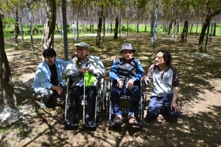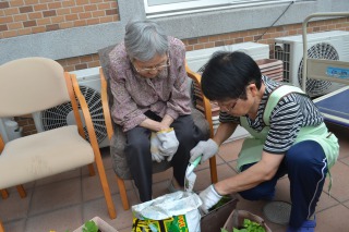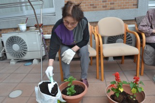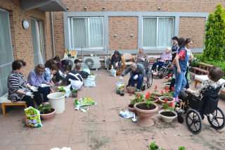 皆様方と一緒にテラスにて花の植え付けを行いました。
