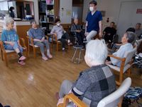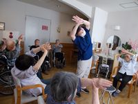 棒を使って上半身を伸ばした後、椅子に座りながら足を前後左右に動かしました。