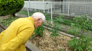 今日もご入居者様から農業指導を受けています。ナス、トマト、きゅうりの