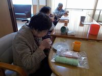 黄色と赤の輪っかを握って握力強化、ダンベルを持って腕力強化、キャッチボールも行いました。