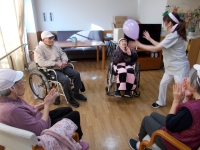 ご利用者様に混ざり職員も一緒に玉入れや風船バレーなどを共に楽しみました。