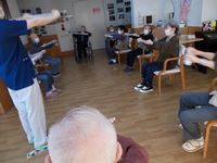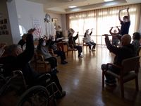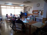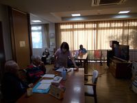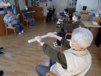 週3回の機能訓練。今日は道具を使って全身体操です。元気一杯ですね( ´艸`)。