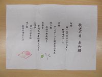 内閣総理大臣からのお祝いの賞状と記念品の銀杯、市町村からのお祝いの賞状と記念品を