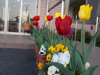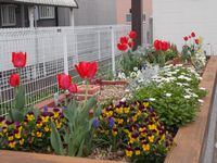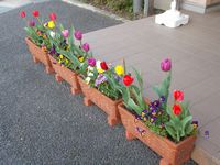 玄関の鉢に植えたチューリップが鮮やかに咲きました!