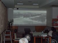 プロジェクターとカラオケ機械のアンプを使い、本格的な