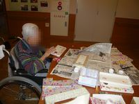 ご入居者様と一緒に、箱無しティッシュを入れるティッシュ箱を