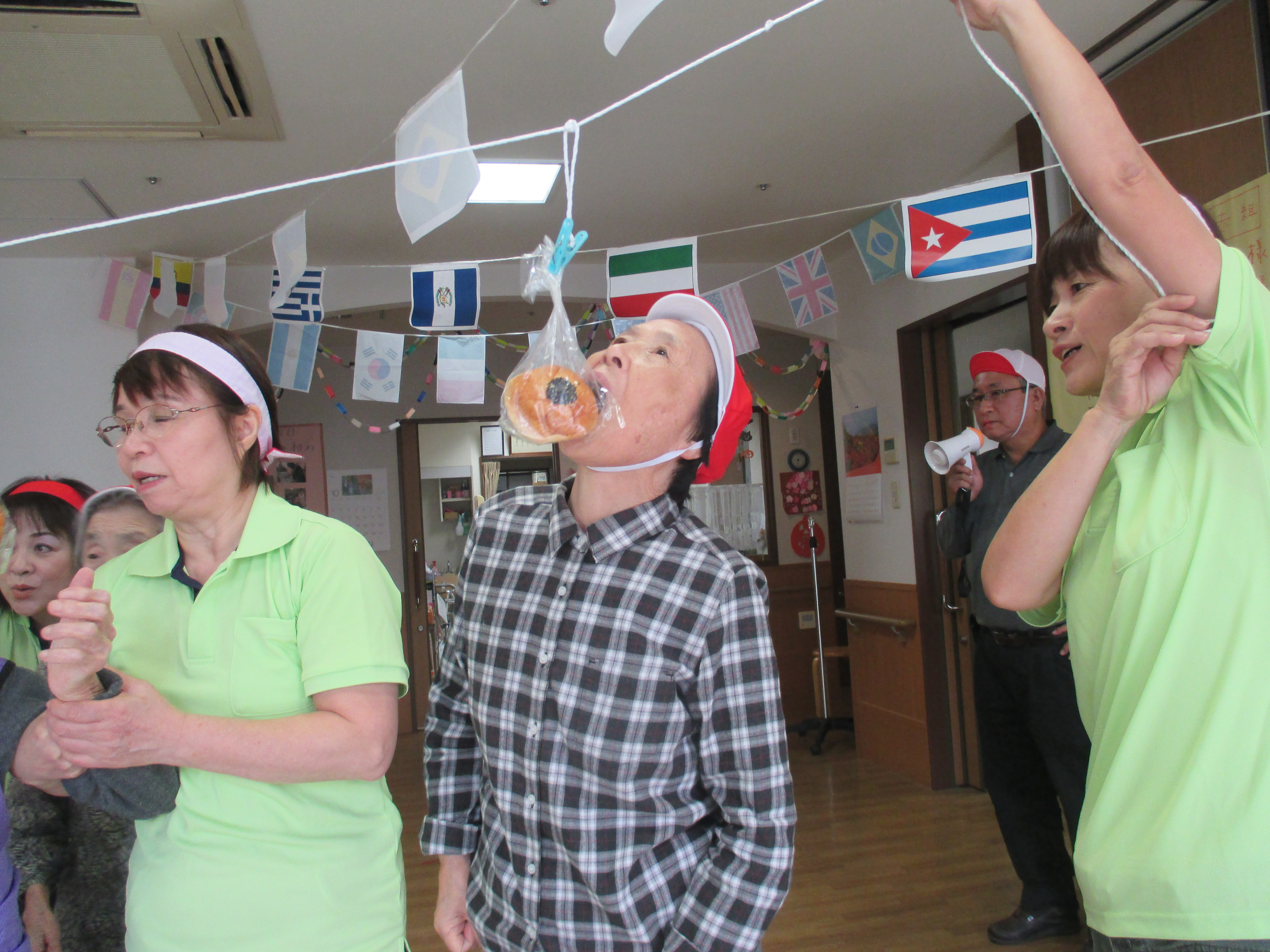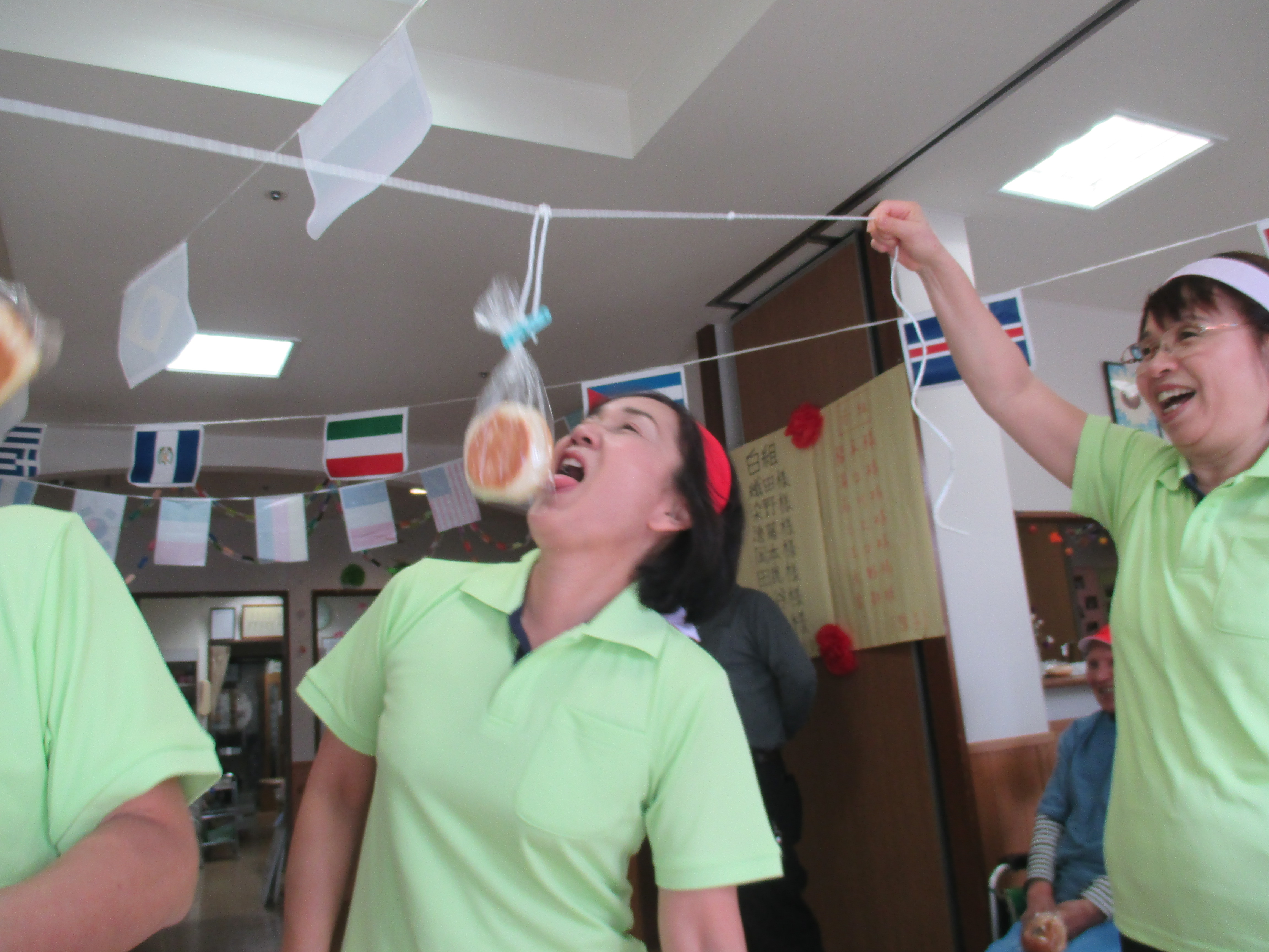 パン食い競争の個人戦もとても盛り上がりました。手を使わず上手に口で引っ張って美味しいあんぱんを獲得していました。