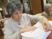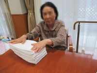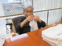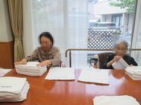 1つのテーブルに集まって洗濯物やおしぼりを綺麗に