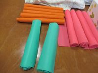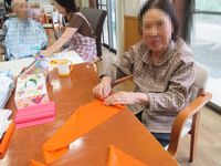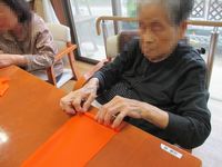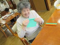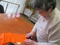 運動が終わると、ご利用者様はゴムひもを干してから1枚ずつ丁寧にくるくると丸めてくださいます。今日は、片づけをして下さっている何気ないお姿を撮影させていただきました。