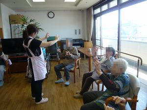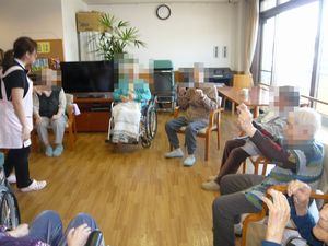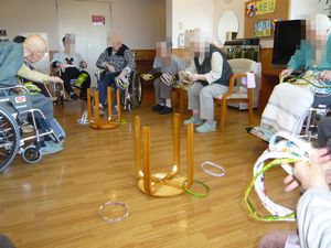 ます。ご利用者様達は、とても和気あいあいと体操を楽しまれておられます。今日の最後は、輪投げに決定です。上半身を大きく