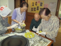 戦時中、少ない食料の中でさつま芋を茹でてよく作っていたそうです。今回は黒ゴマやピーナツを入れ焼きました。