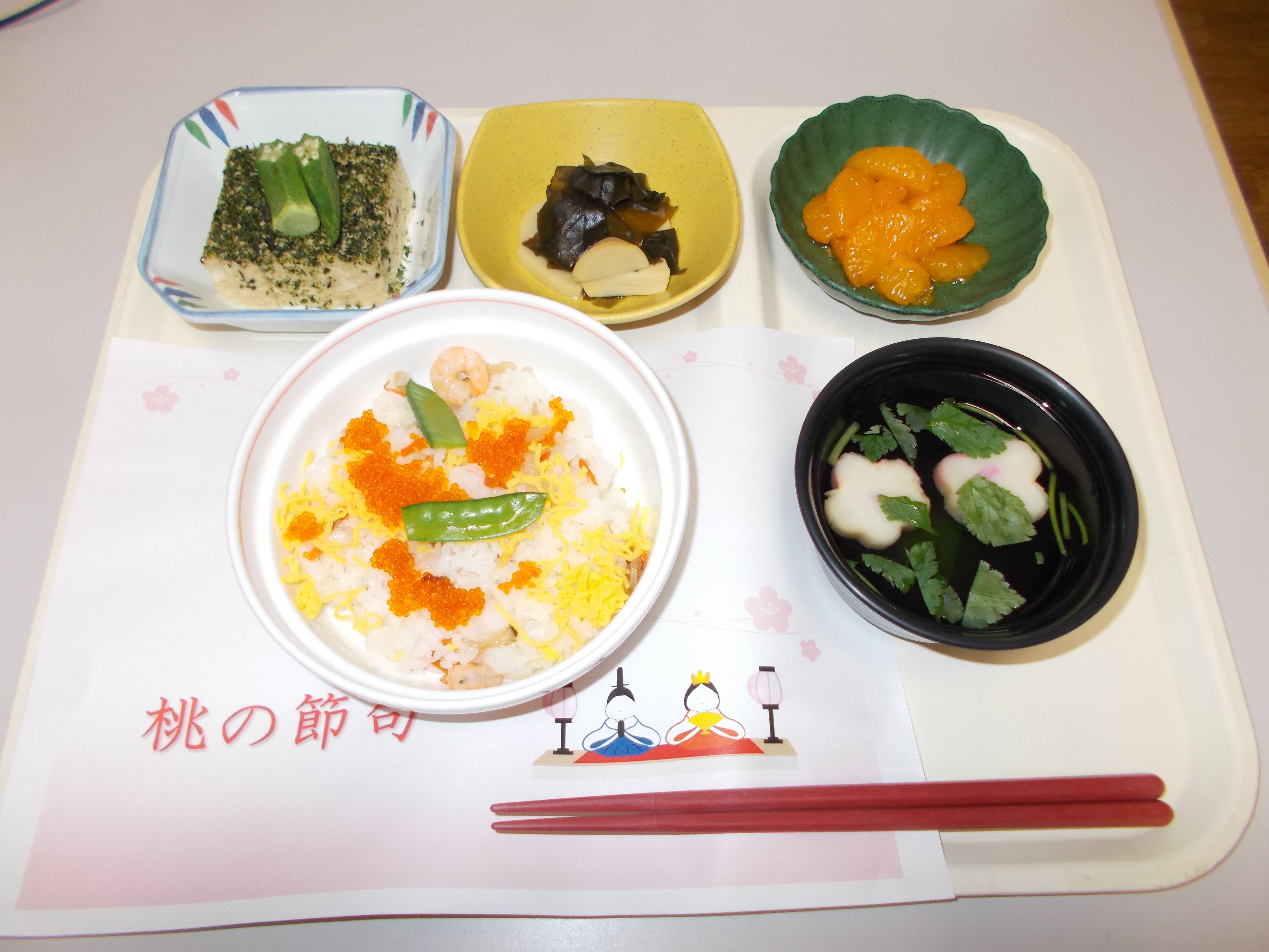 ランチは雛チラシ、清汁、松風焼き、若竹煮、フルーツ。