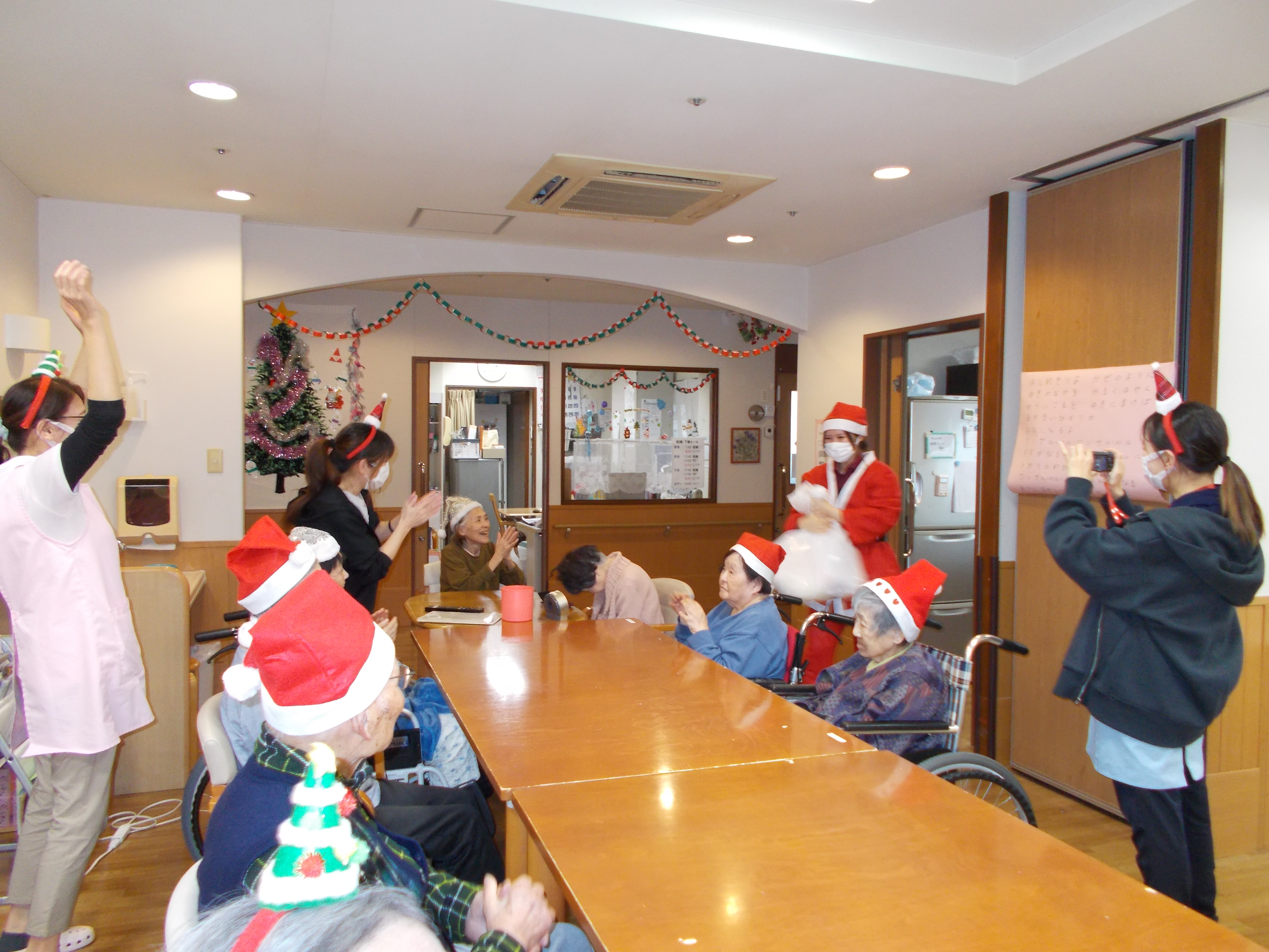ご利用者様とスタッフで一緒にクリスマスソングを歌って、ハンドベルの出し物があって、サンタがプレゼントを配って、写真撮影をして、おやつを食べて。