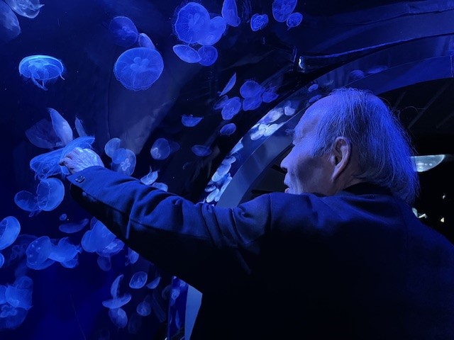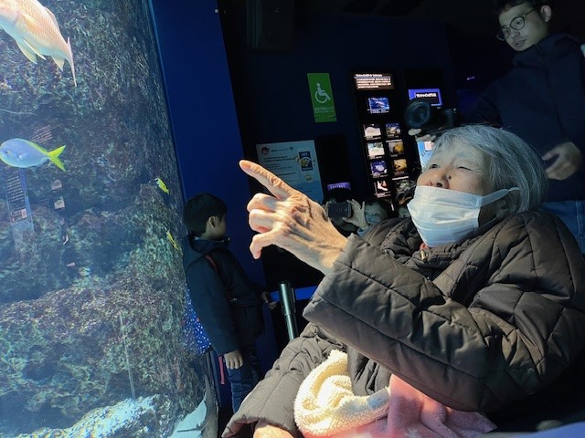 水族館の中では暗い中、水槽が明るくとても雰囲気が良かったです。入居者様も指を指しながら「この魚はなんだろ?」「こっちに来たよ!」などとても楽しまれたご様子。