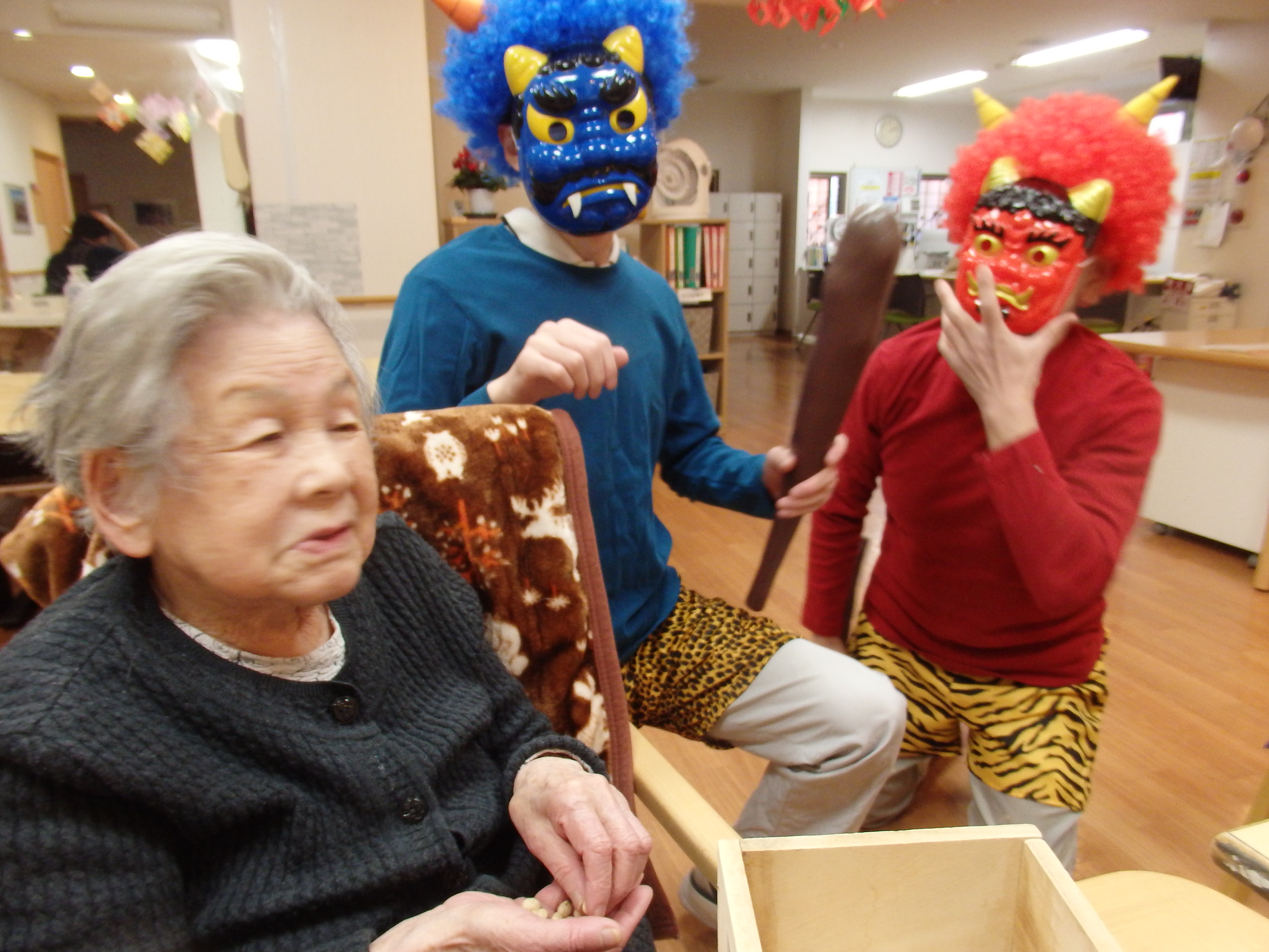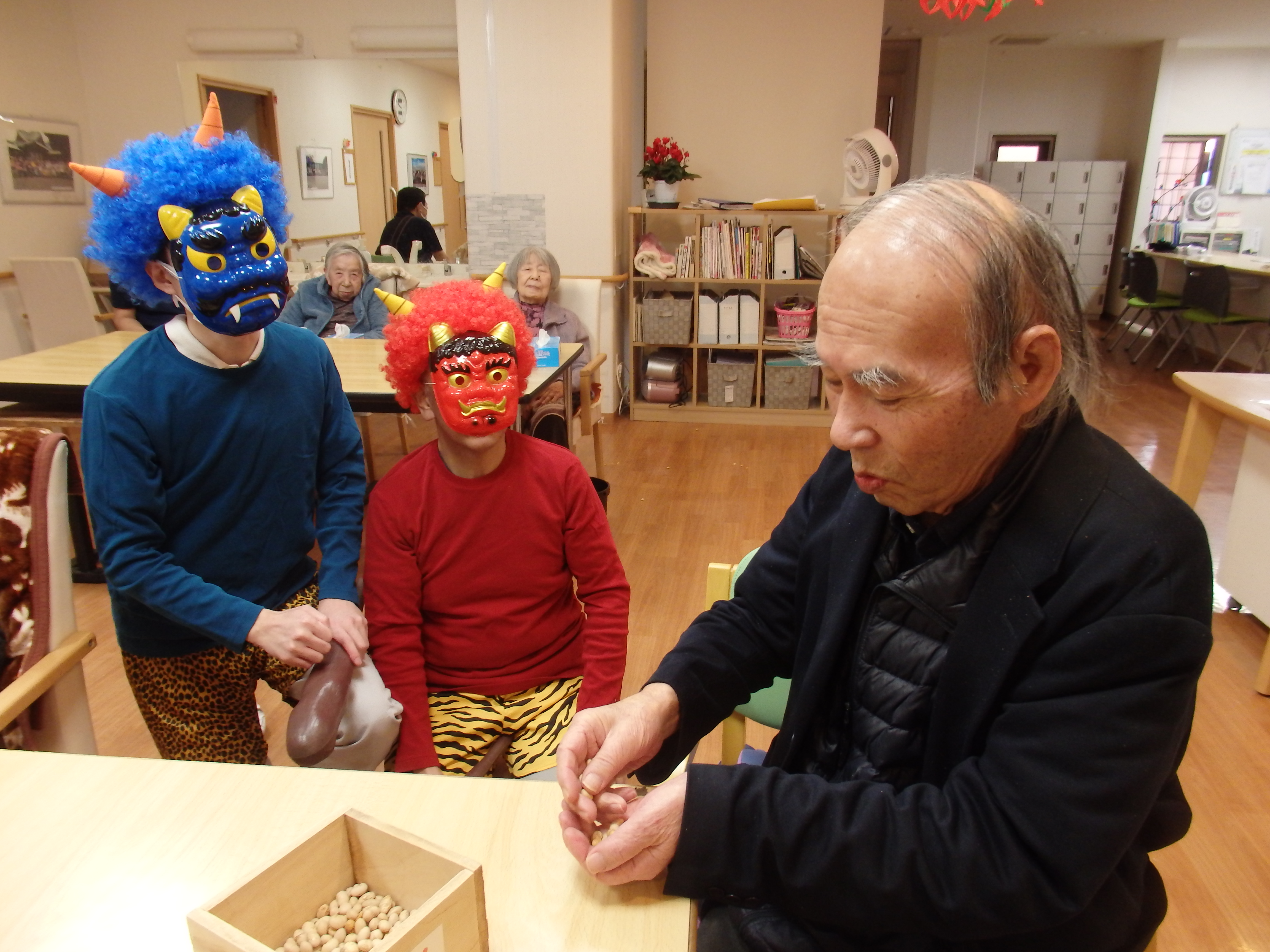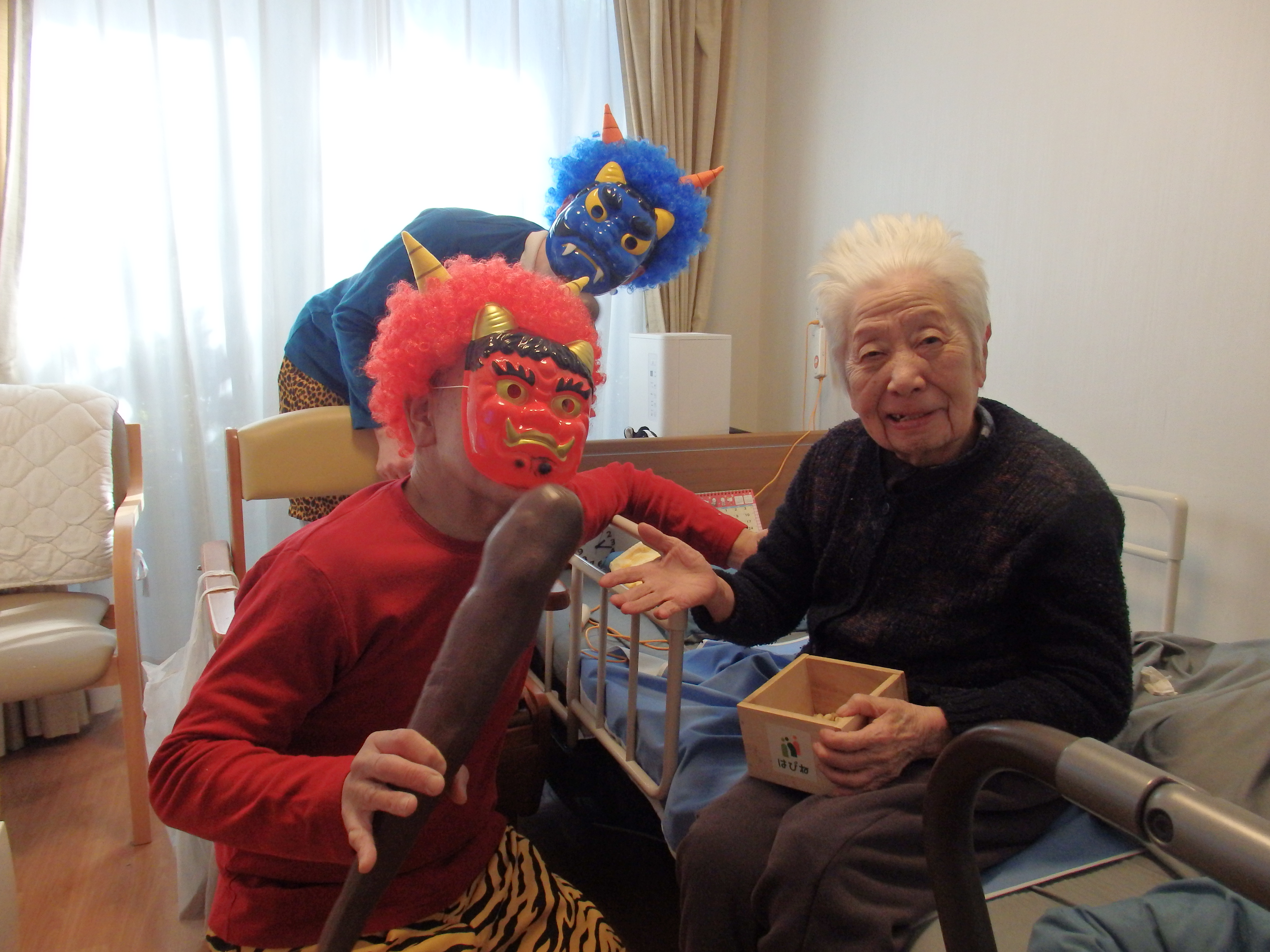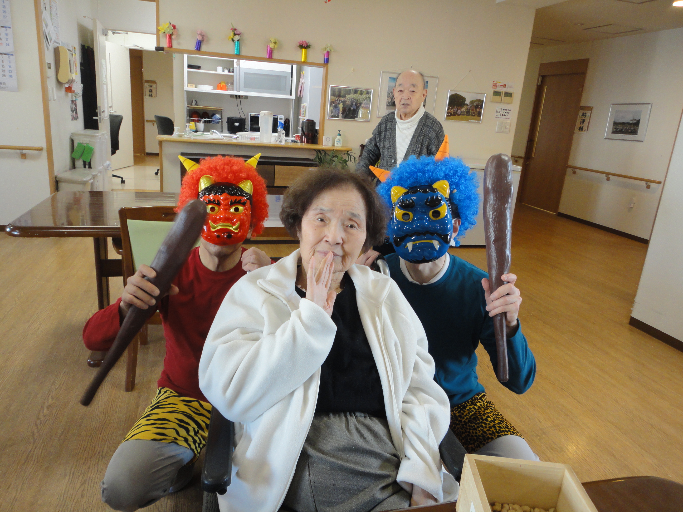 迎え撃つは、豆を持った入居者様方