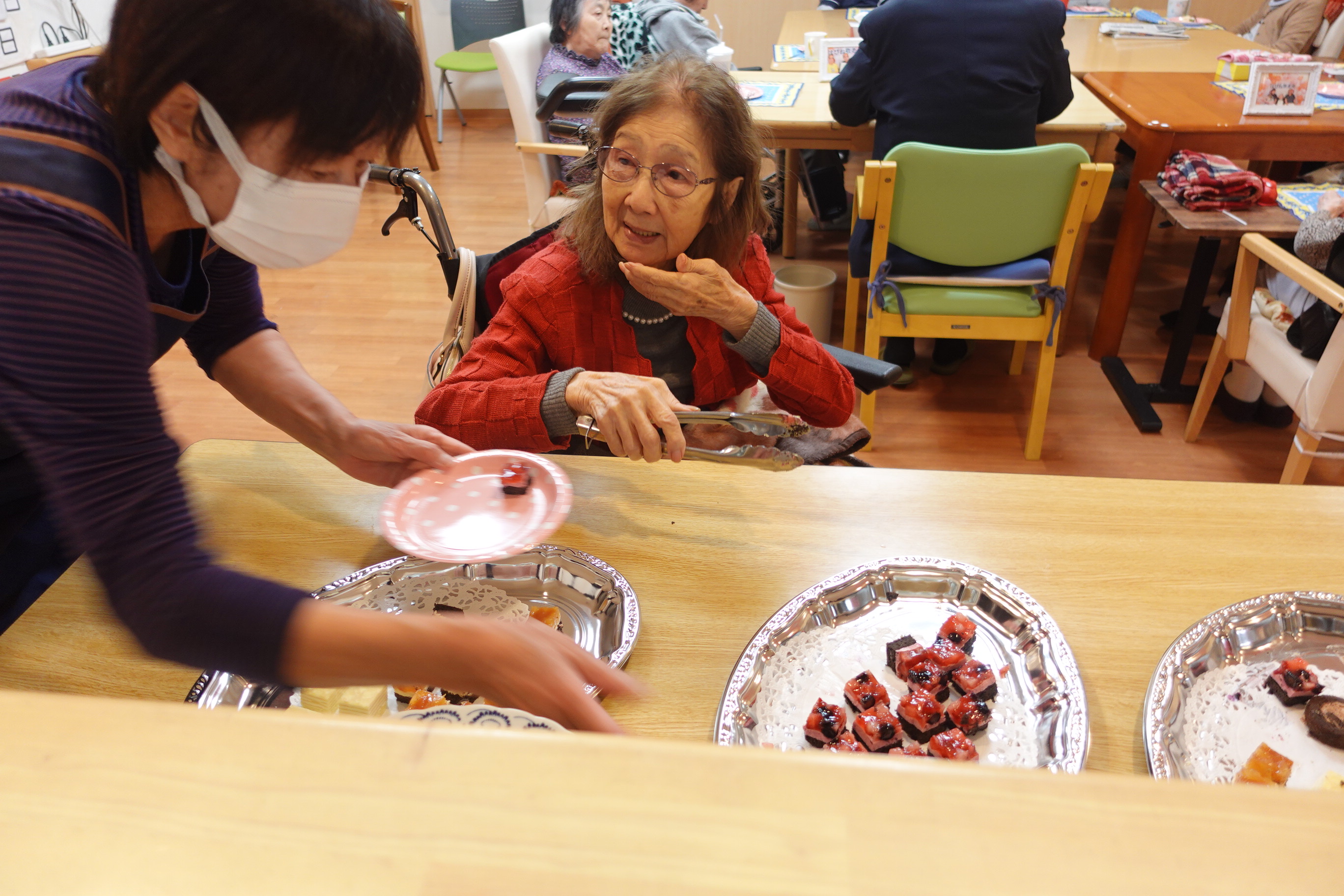 本日はおやつの時間に1階でケーキバイキングを行いました!
