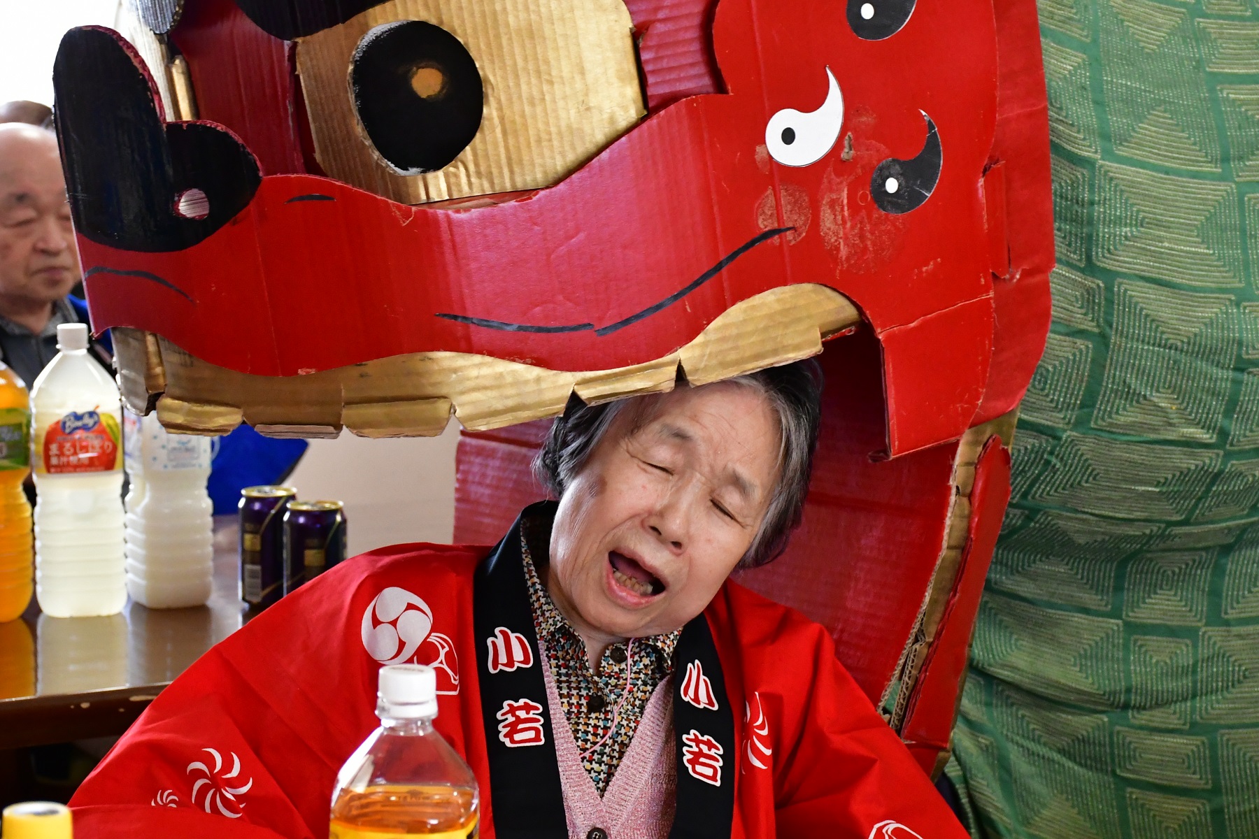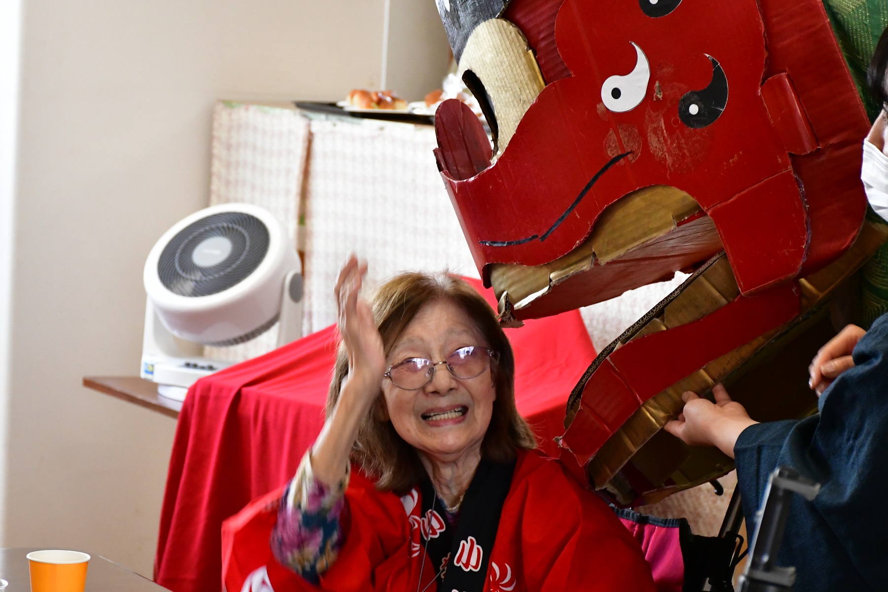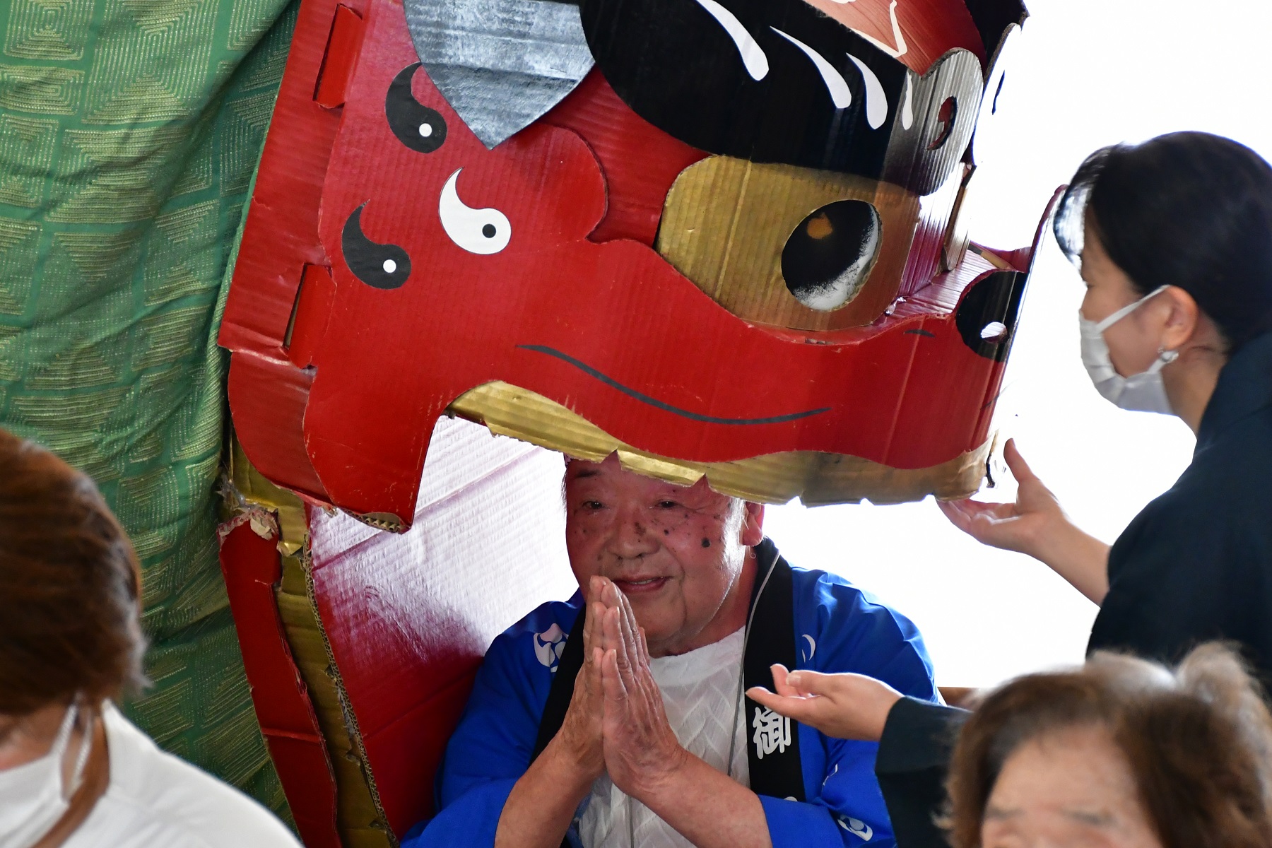 恒例となっている、獅子舞に頭をかんで頂く儀式を!