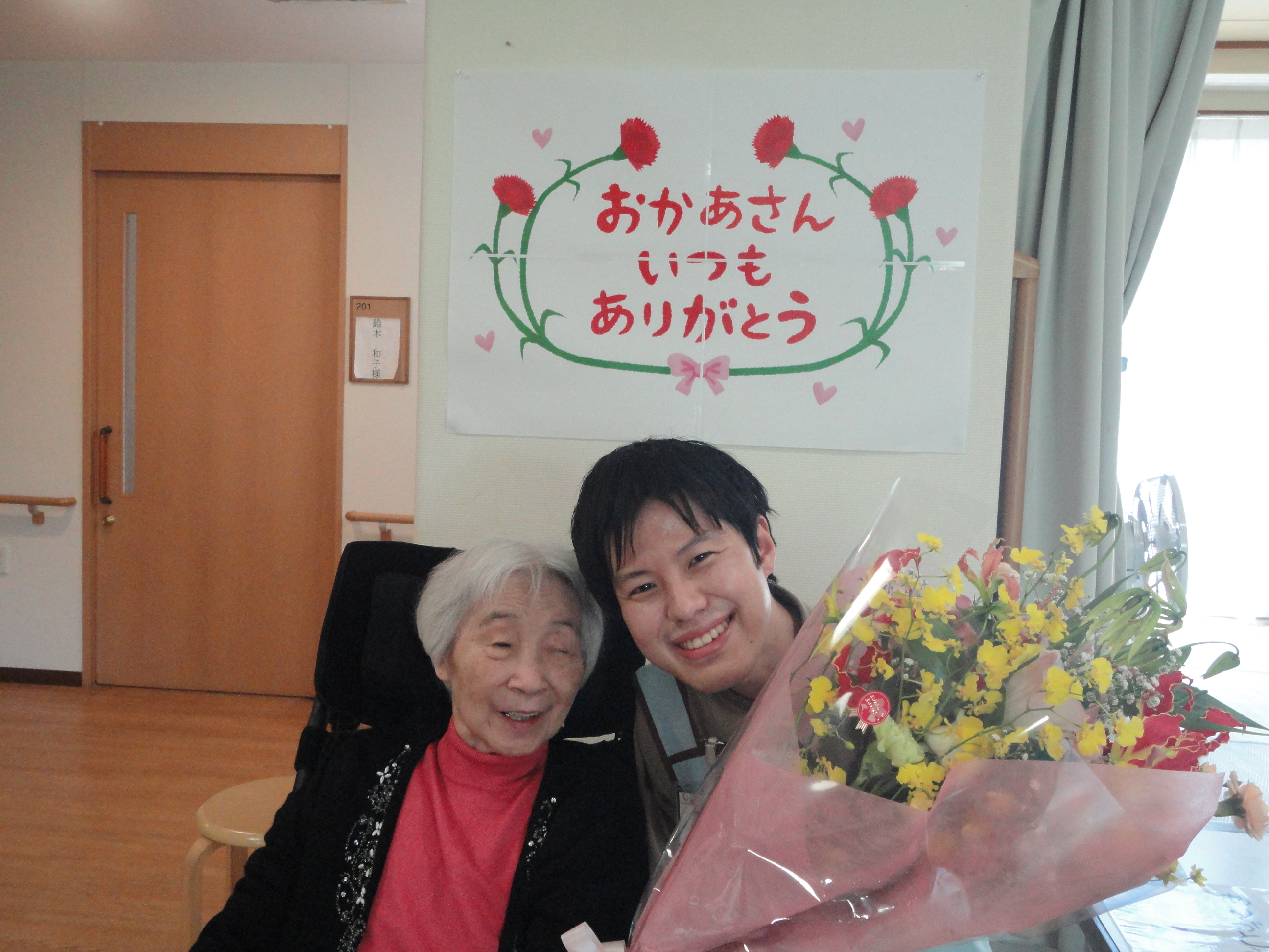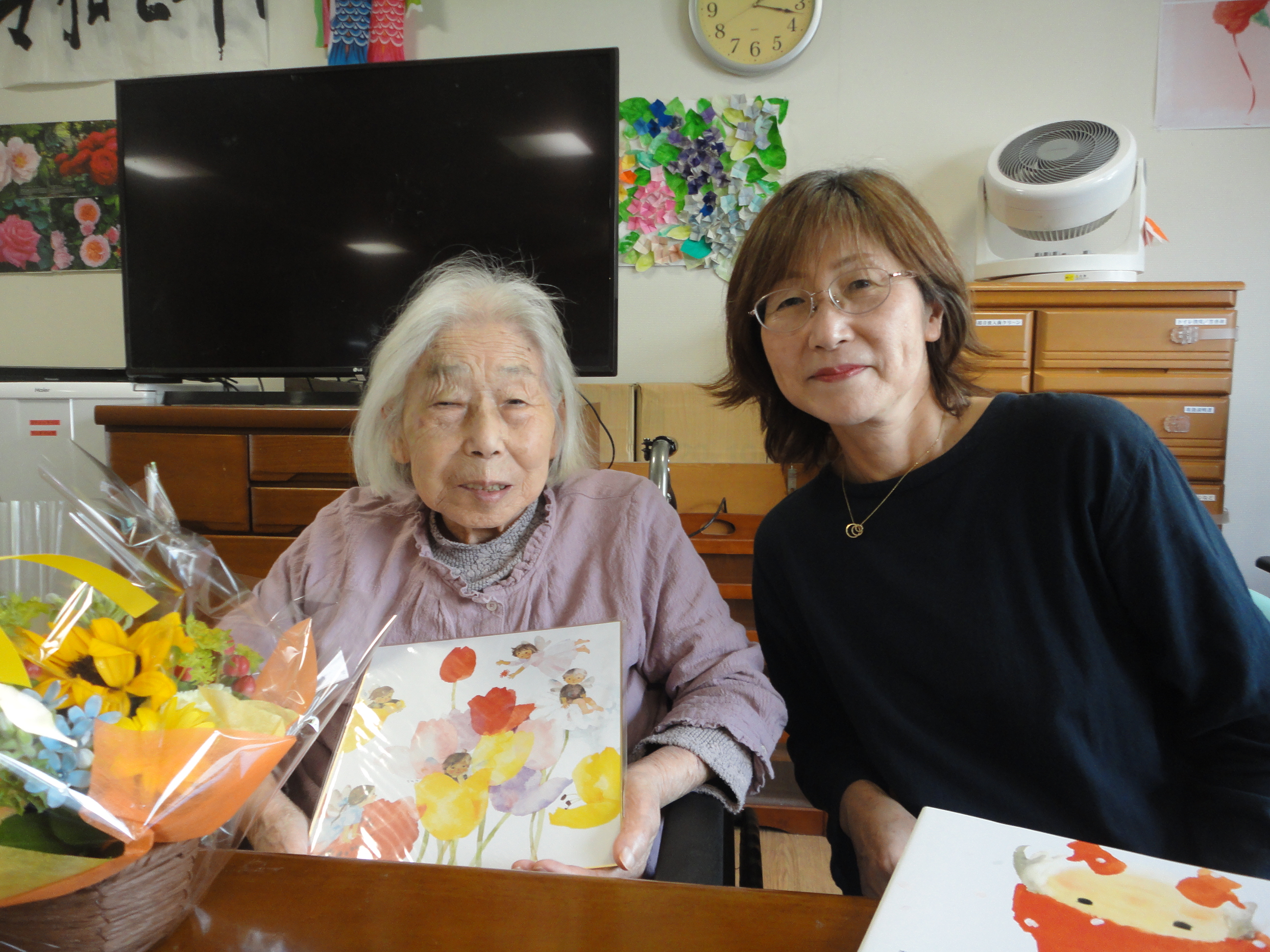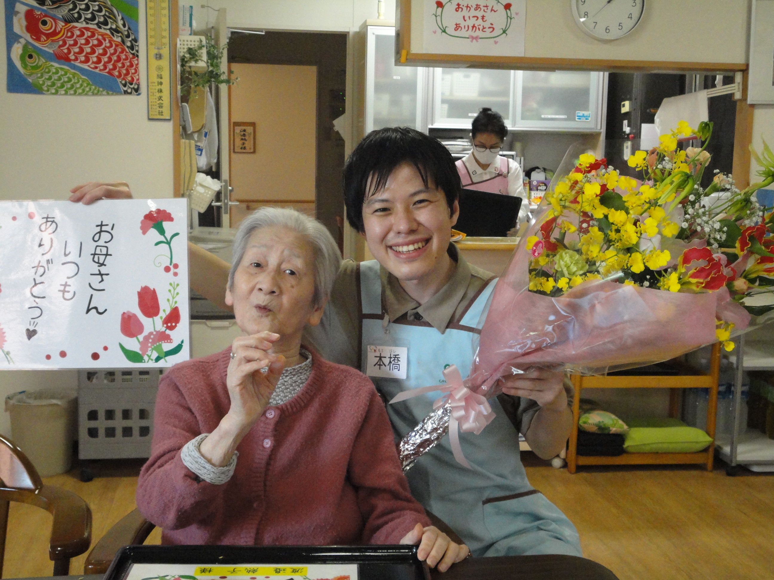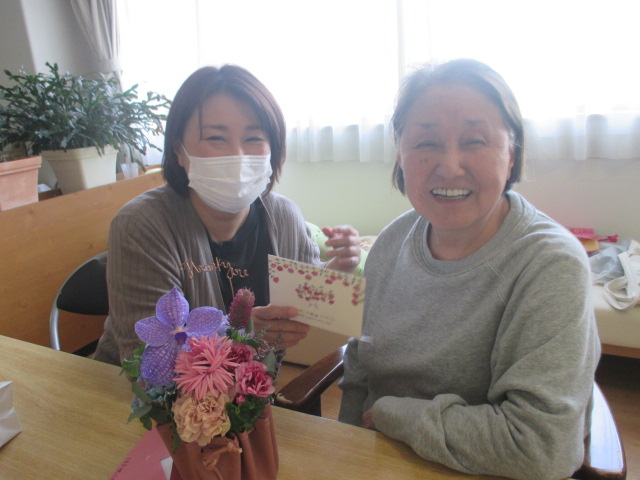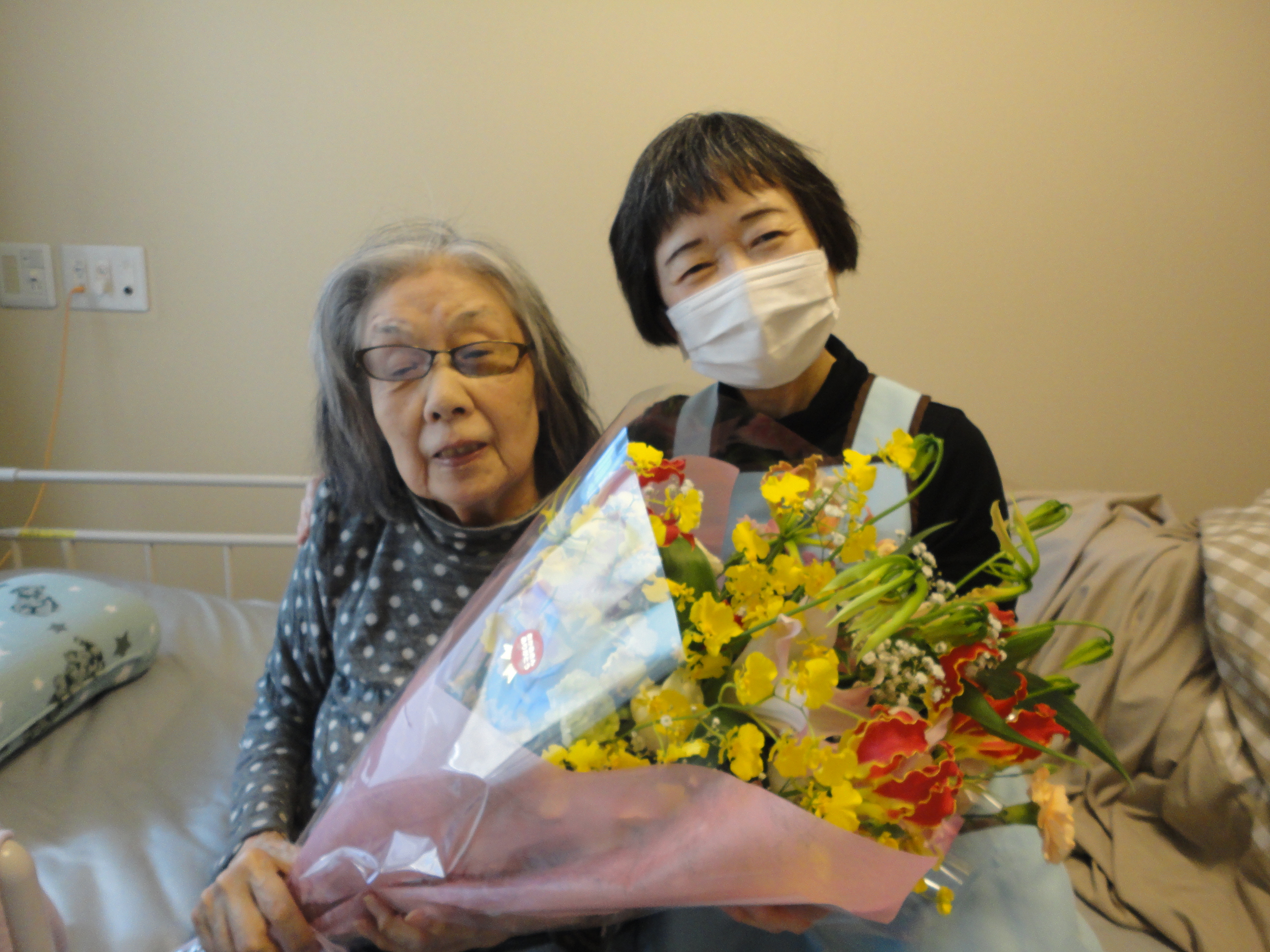 ご家族の方またはスタッフと一緒にお祝いの花束・ポスターと共に
