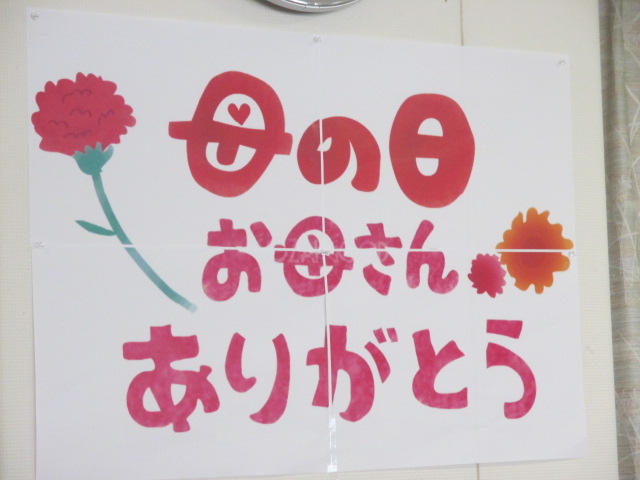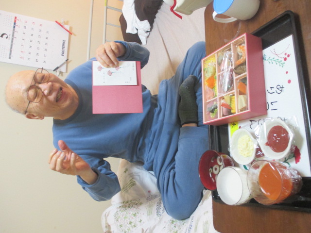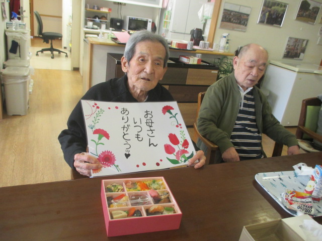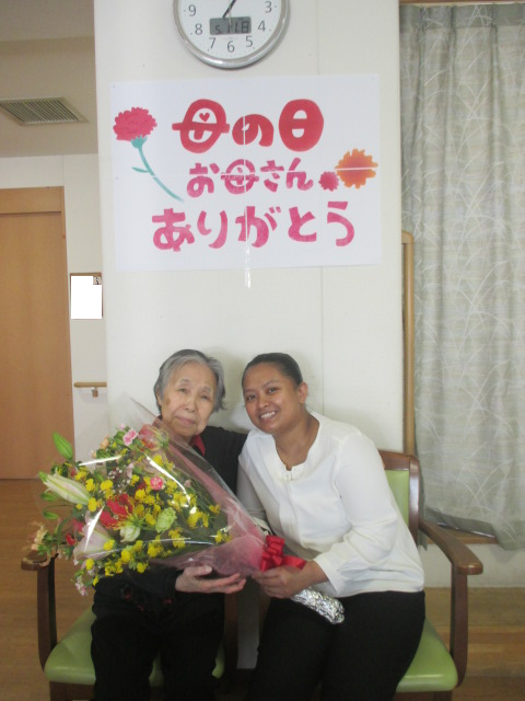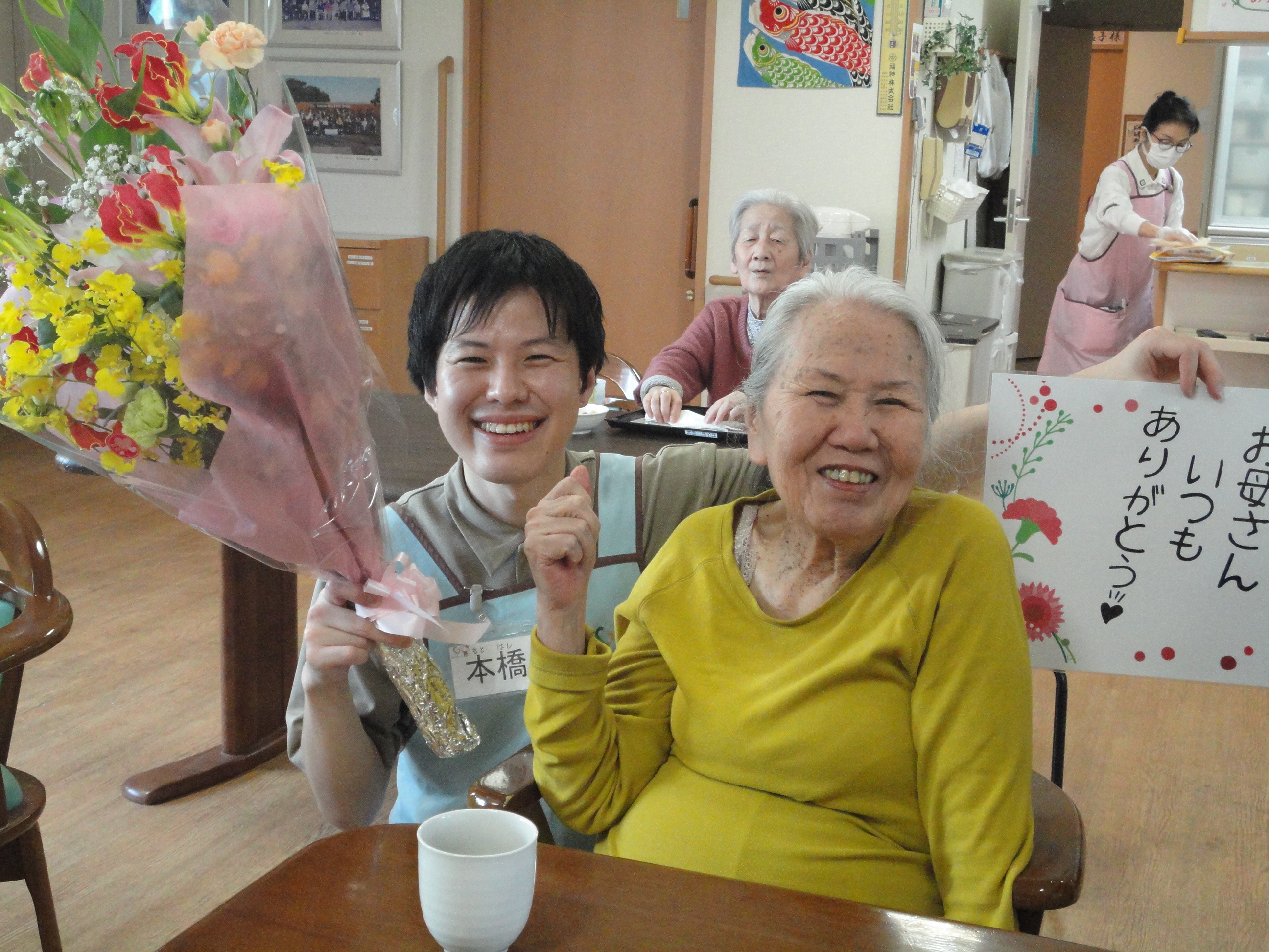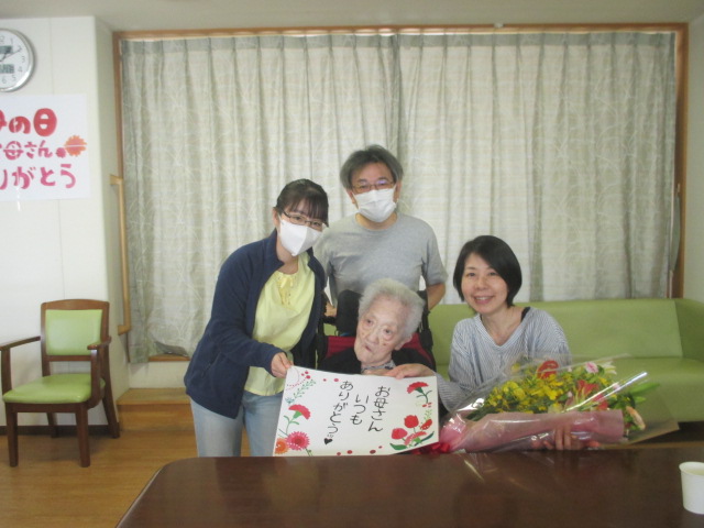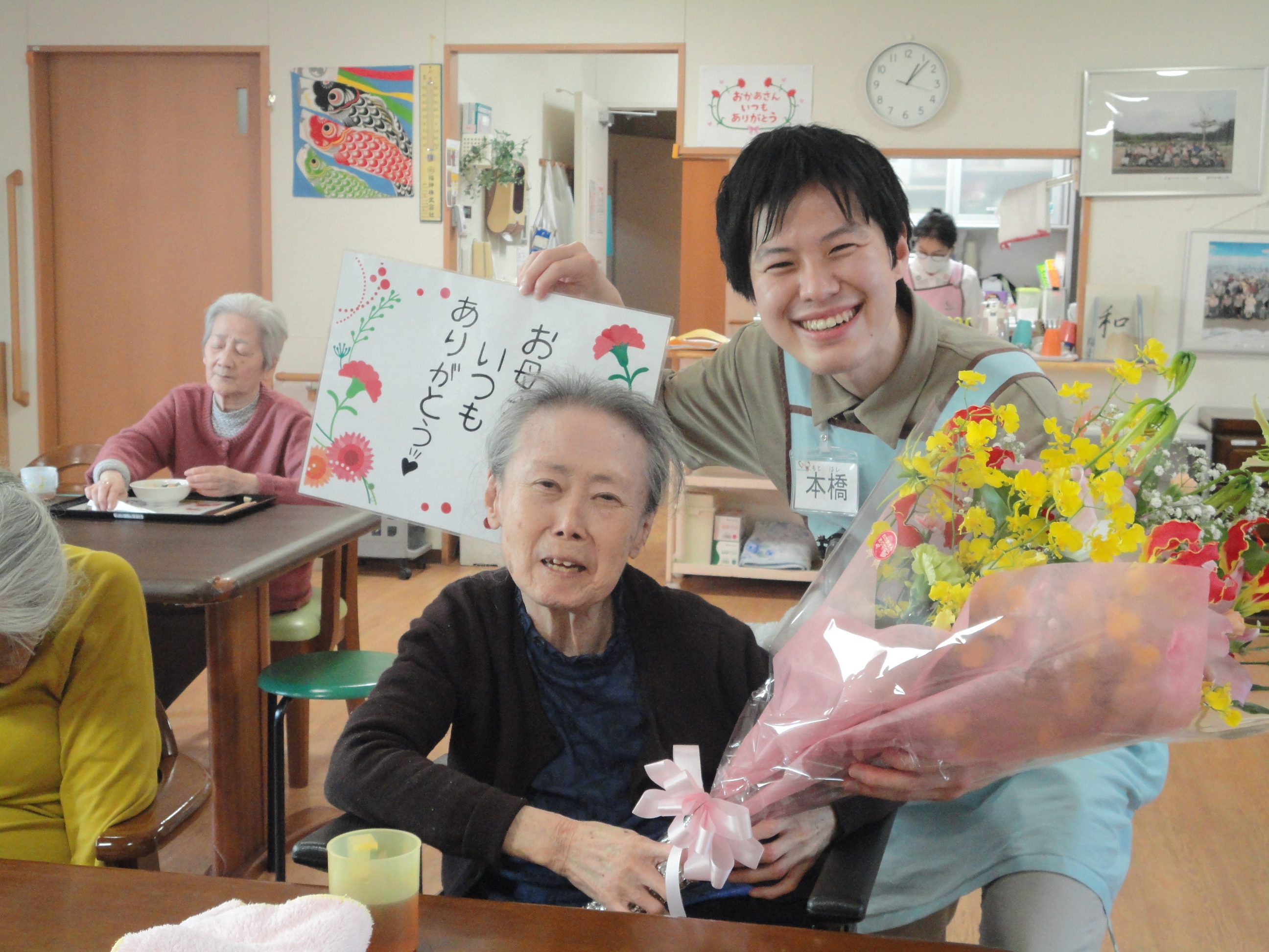 ご家族の方またはスタッフと一緒にお祝いの花束・ポスターと共に