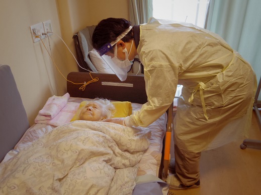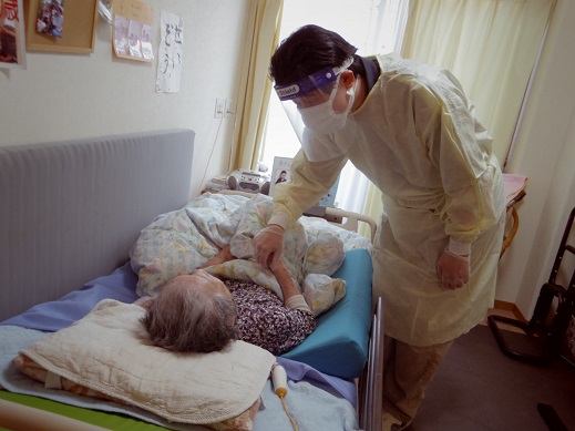 実際に入居者皆さんにお部屋に避難していただきスタッフは防護服を着ての訓練。