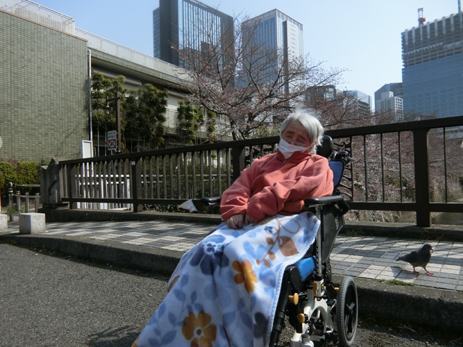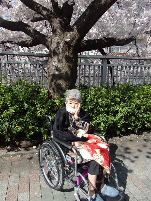 今「この瞬間」の大事な時を職員付き添いにて散歩に行き、入居者様には桜を楽しんでいただいております。