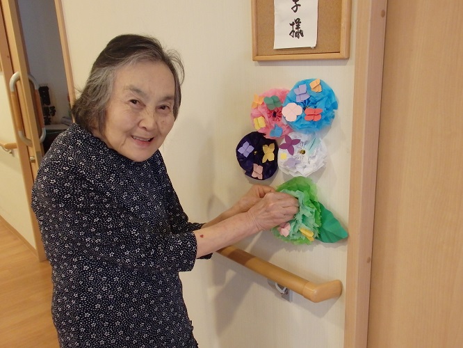 本日は、紙で手作りをした紫陽花飾りを