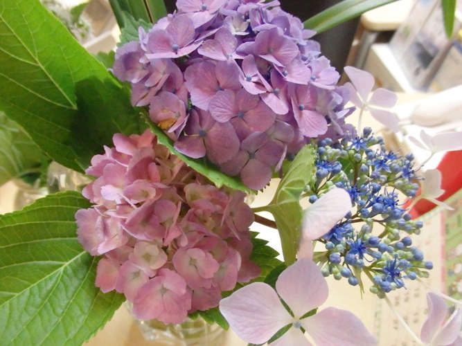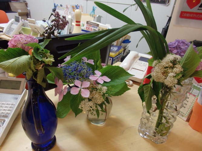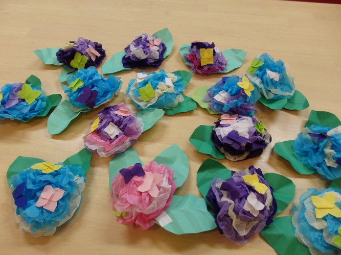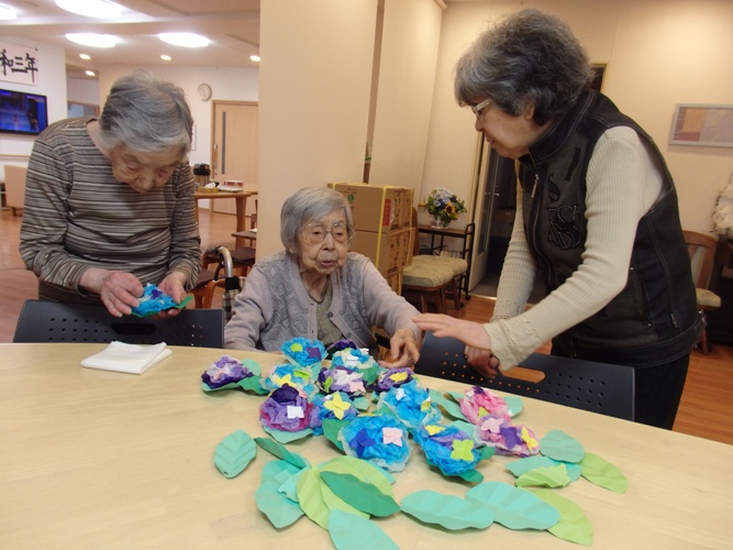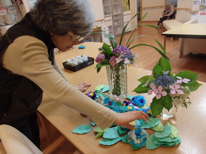 今回は手作りの紫陽花と本物の紫陽花でフロアの飾り付けを入居者様と行ないました^^