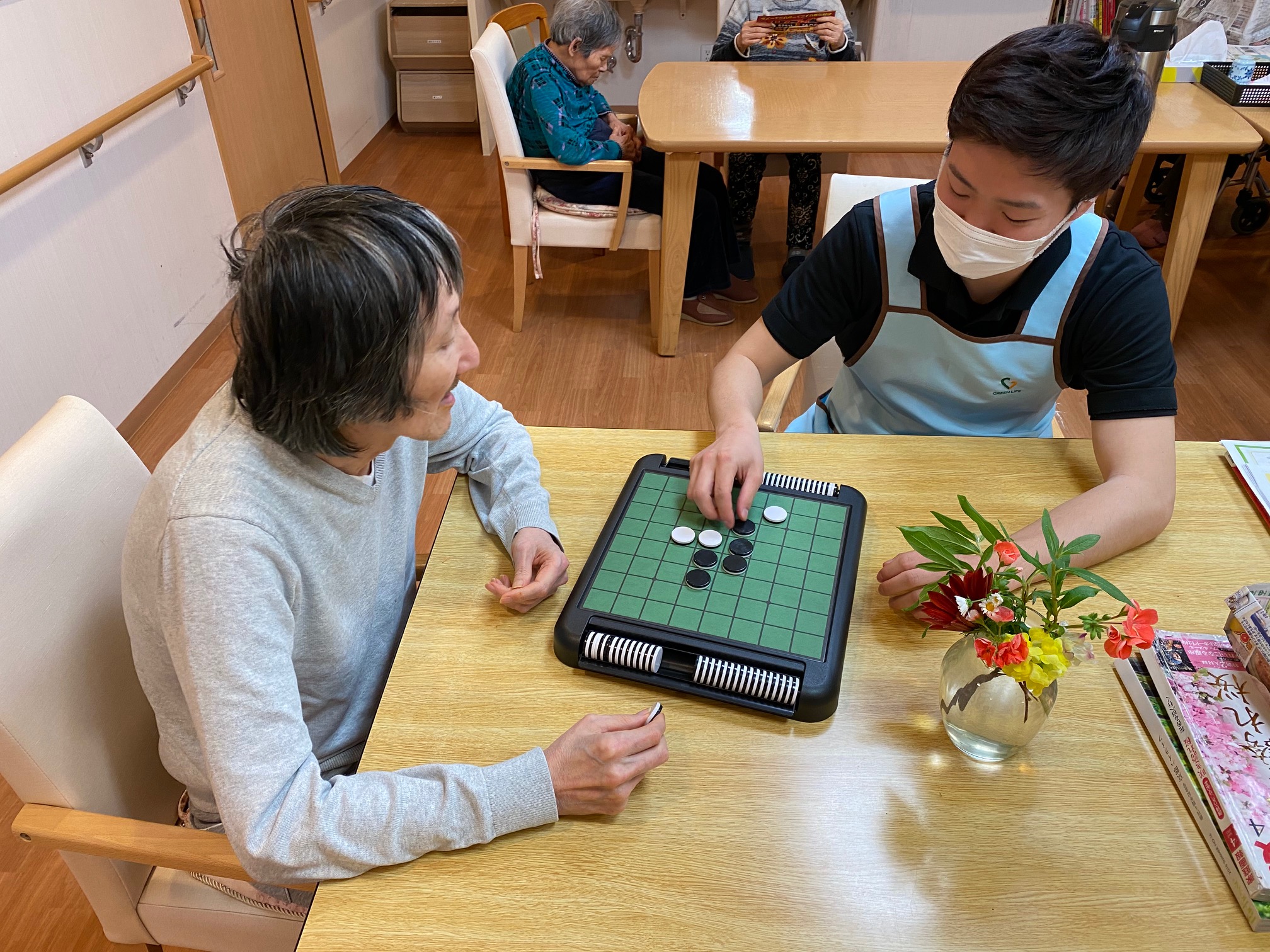 職員と入居者様がほのぼのとオセロの練習をしておりました。