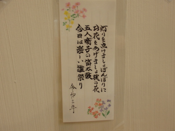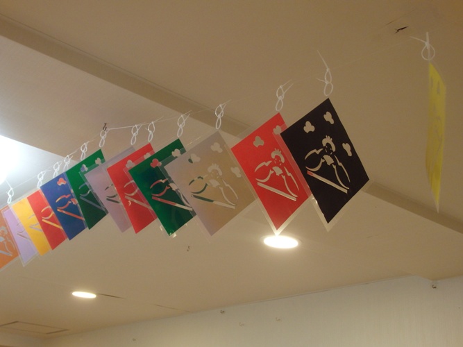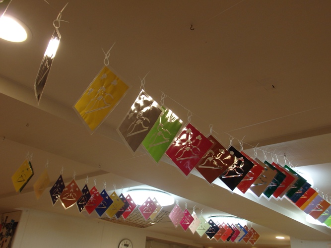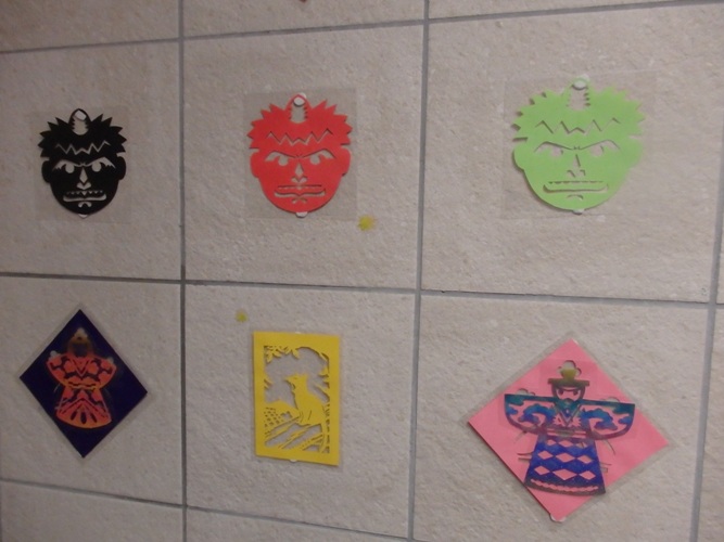 スタッフ自作のおひなさまの切り絵がリビングの天井に見事にならんでおります。