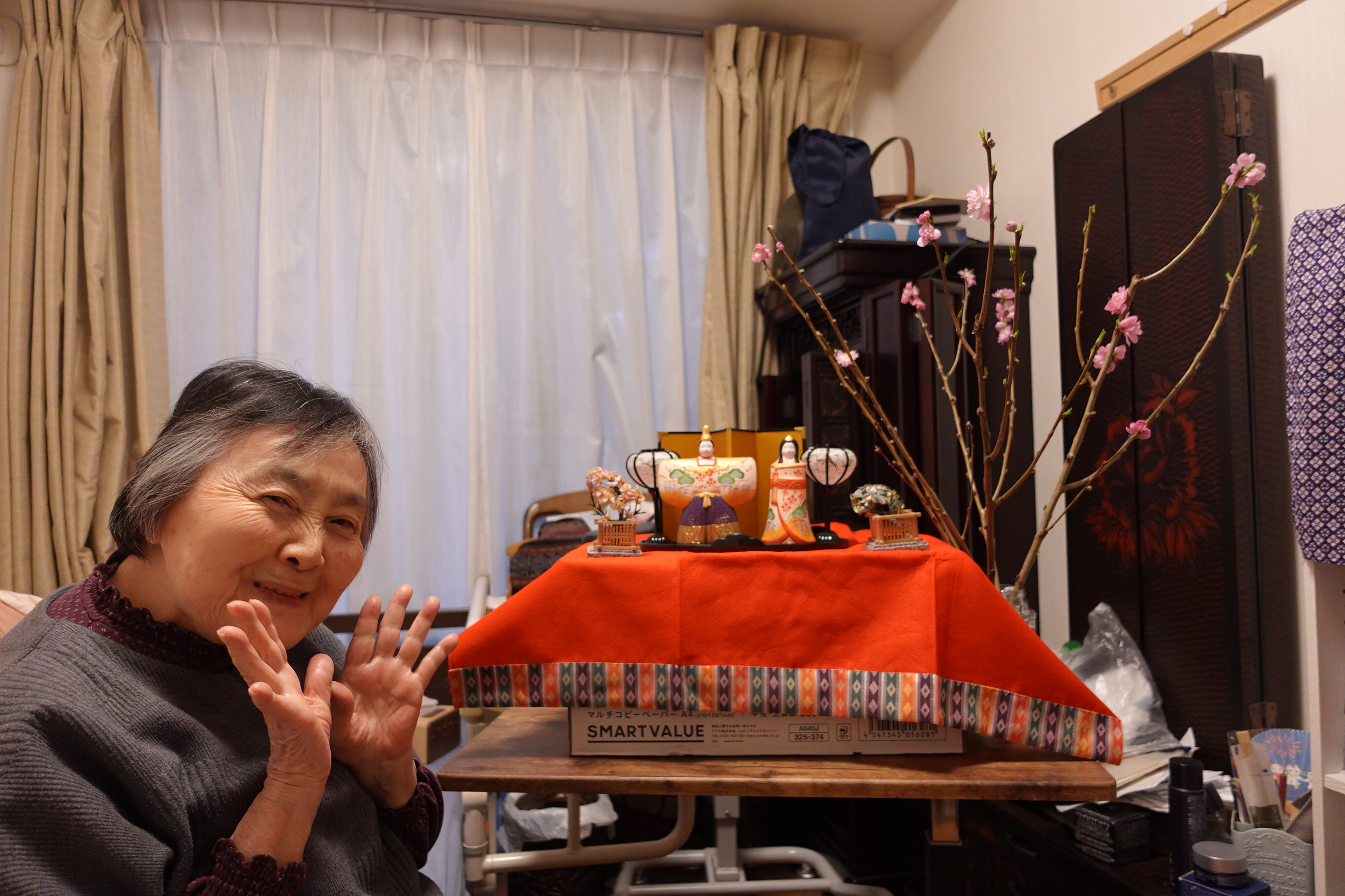 小さなひな壇を作って、桃の花と一緒に記念撮影を行いました。
