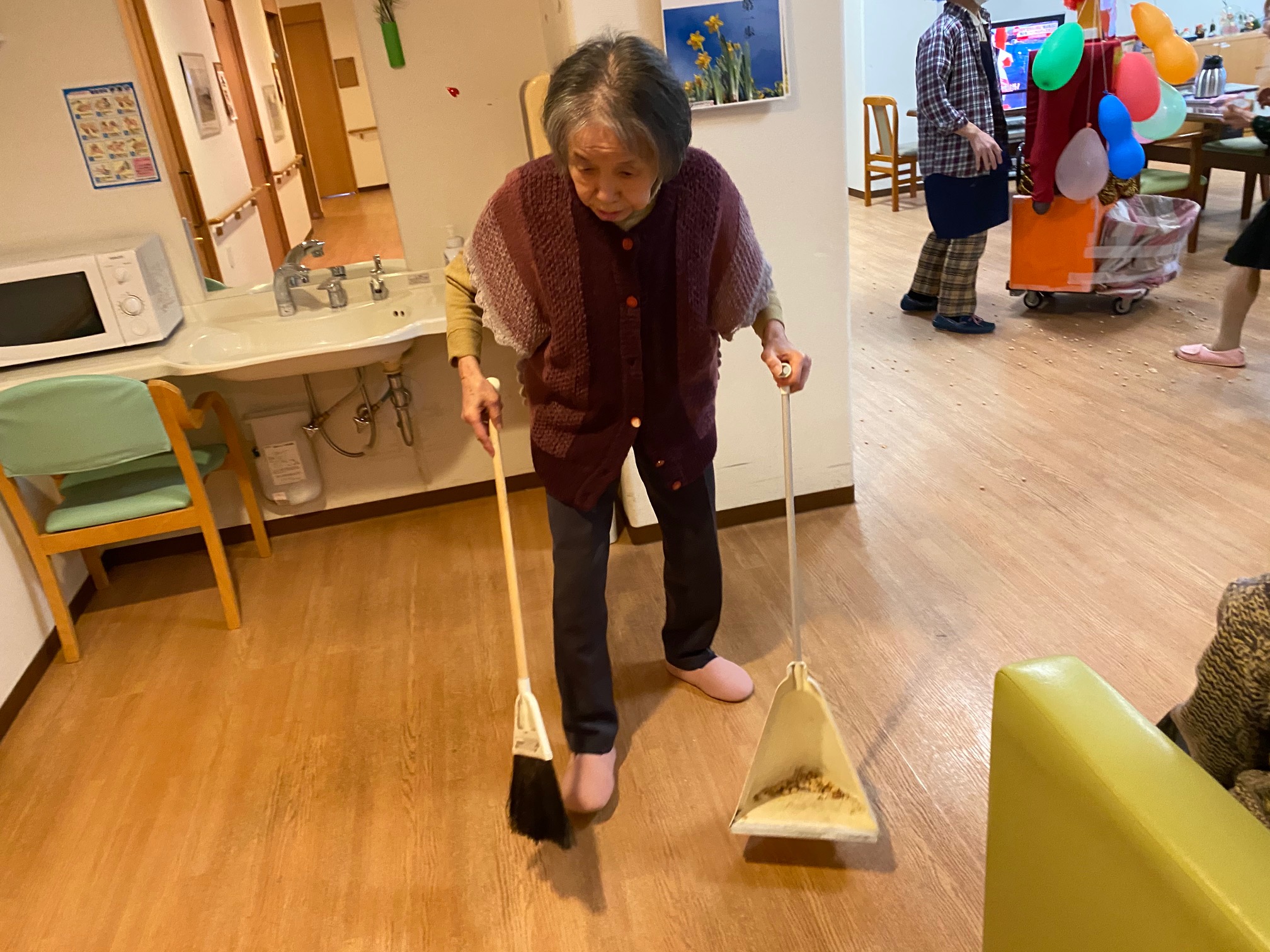 豆の片付けも皆様手分けして箒で掃除を笑