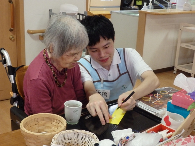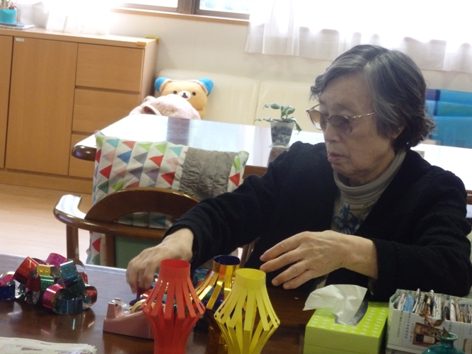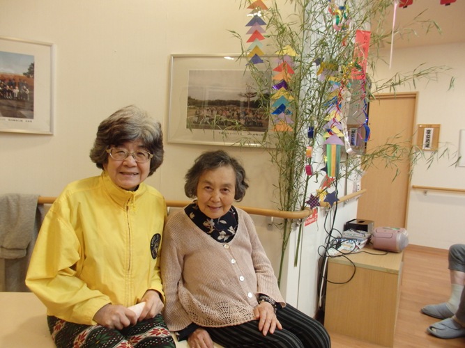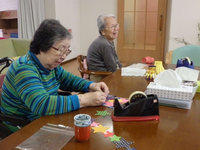 まもなく7日の七夕を迎えます。今年も入居者の方と一緒に飾りを作り、七夕の飾り付けを行ないました。