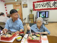今回用意したお弁当は「おこわ弁当」。各階でご家族様と楽しんだり、他のご家族様とも交流を図ったりしながら美味しいお弁当をいただきました。
