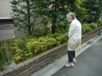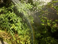 これからの暑い夏を乗り切るためにも束の間の“涼”が欲しくなりますが、昔ながらの工夫として打ち水があります。夏季の間、植木への水遣りが日課になっているのでついでに玄関前の道路にも打ち水をしていたところ、虹が出現!