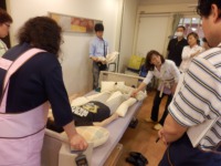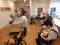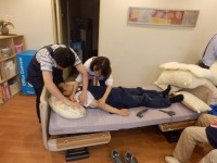 福祉用具販売「すりいでぃ」さんのご協力をいただきながら今回はベッド上の姿勢を中心に、職員がクッションの当て方などを体験していきます。