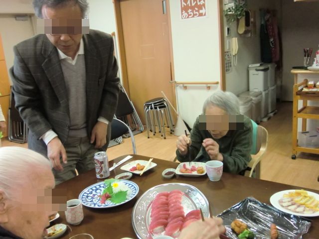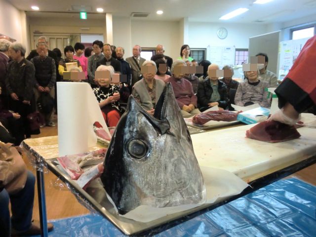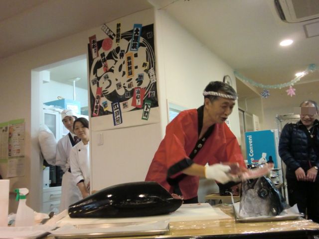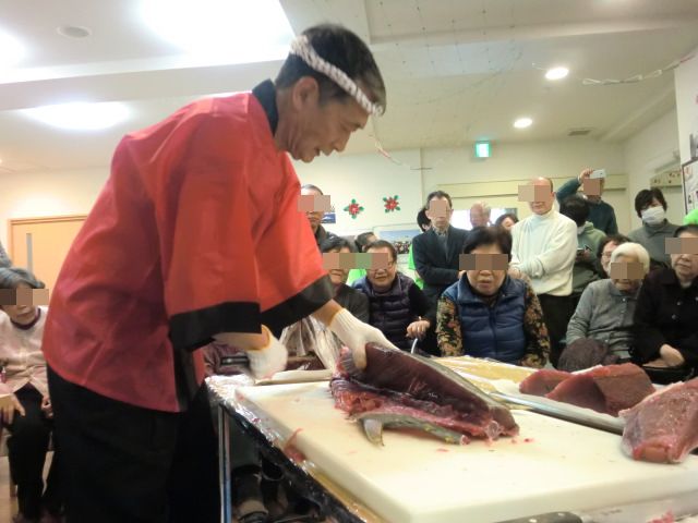 鮪は和歌山産で25Kg。ご入居者代表の方と入刀式?をしてから一気に解体されていきました。部位の紹介などもあり、参加者の皆様は身を乗り出し興味津々のよう。(笑)