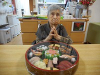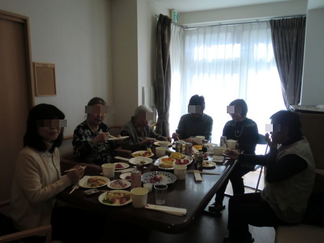 ご入居者の皆さんで「Happy Birthday♪」を歌うと、「ぷ~っ!!」と言葉を出しながらロウソクの火を消し、その後饅頭は各階にお裾分けをしましたが、た~んと残っているので、大好きな饅頭をお腹いっぱい食べていただきました!!