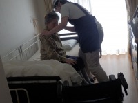 今回は「夜間帯、脱衣室からの出火、フロアには夜勤者一人の状態」を想定した訓練で、電気を消して雰囲気作りをし、ご入居者の皆様にもベッドで待機していただくなど実際の状況にできるだけ近づけられるようにしています。
