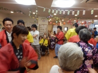 いつもホームのレクリエーション等にご協力いただいているあづま会の皆様を中心に、東京音頭や炭坑節、花笠音頭と踊りましたが、ご入居者の皆様にとって盆踊りは身体に染み付いている動作なので自然と身体が動きます。