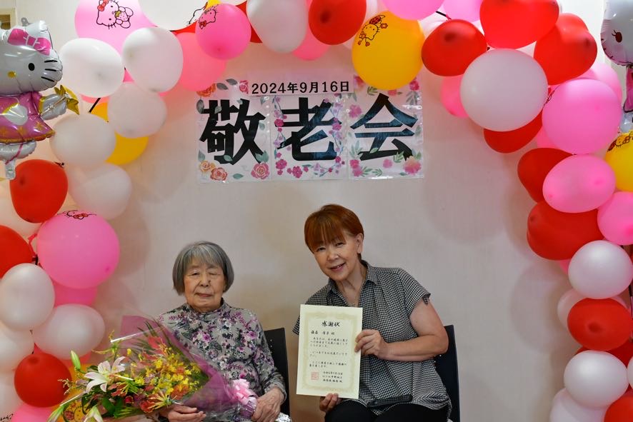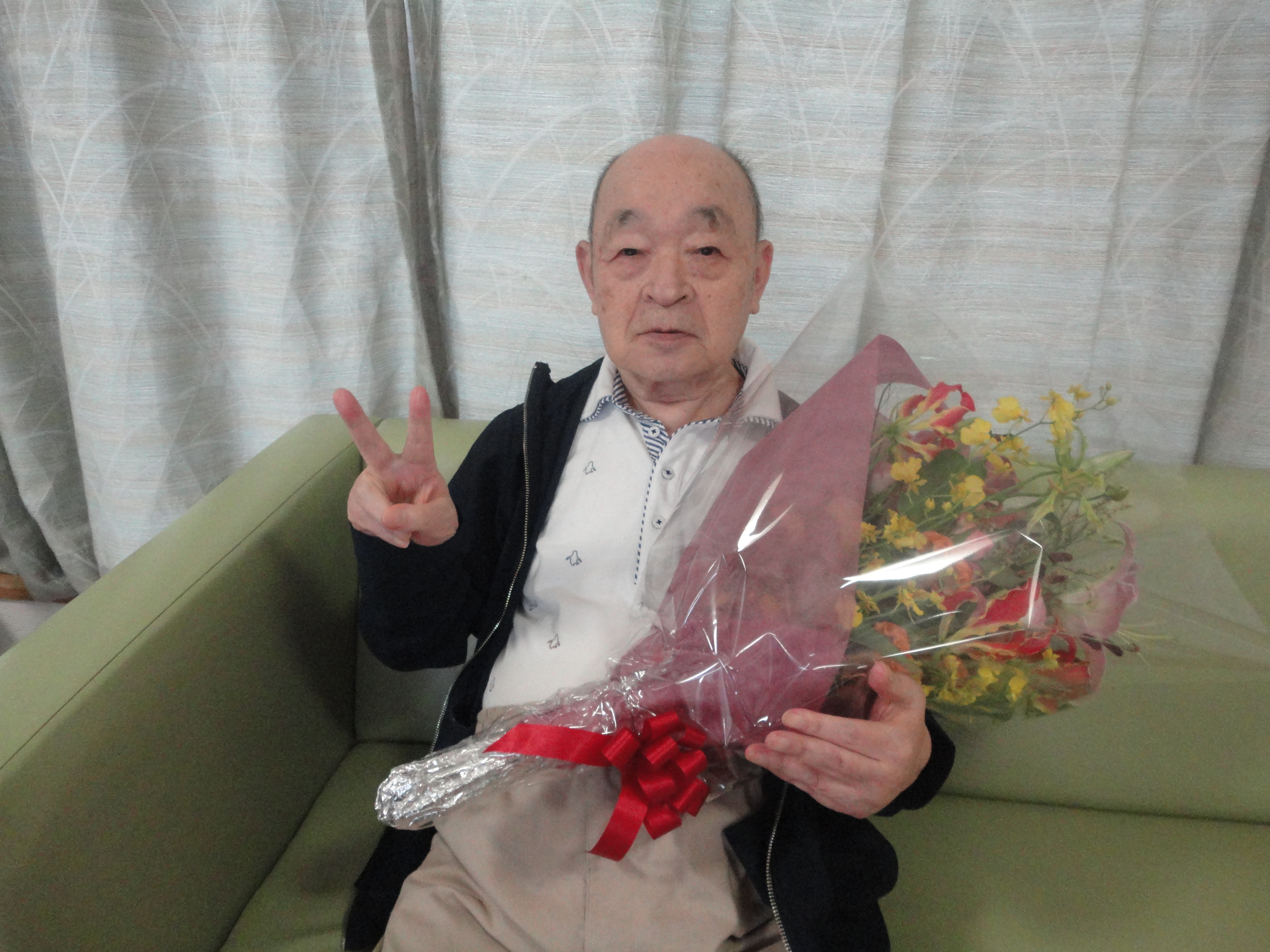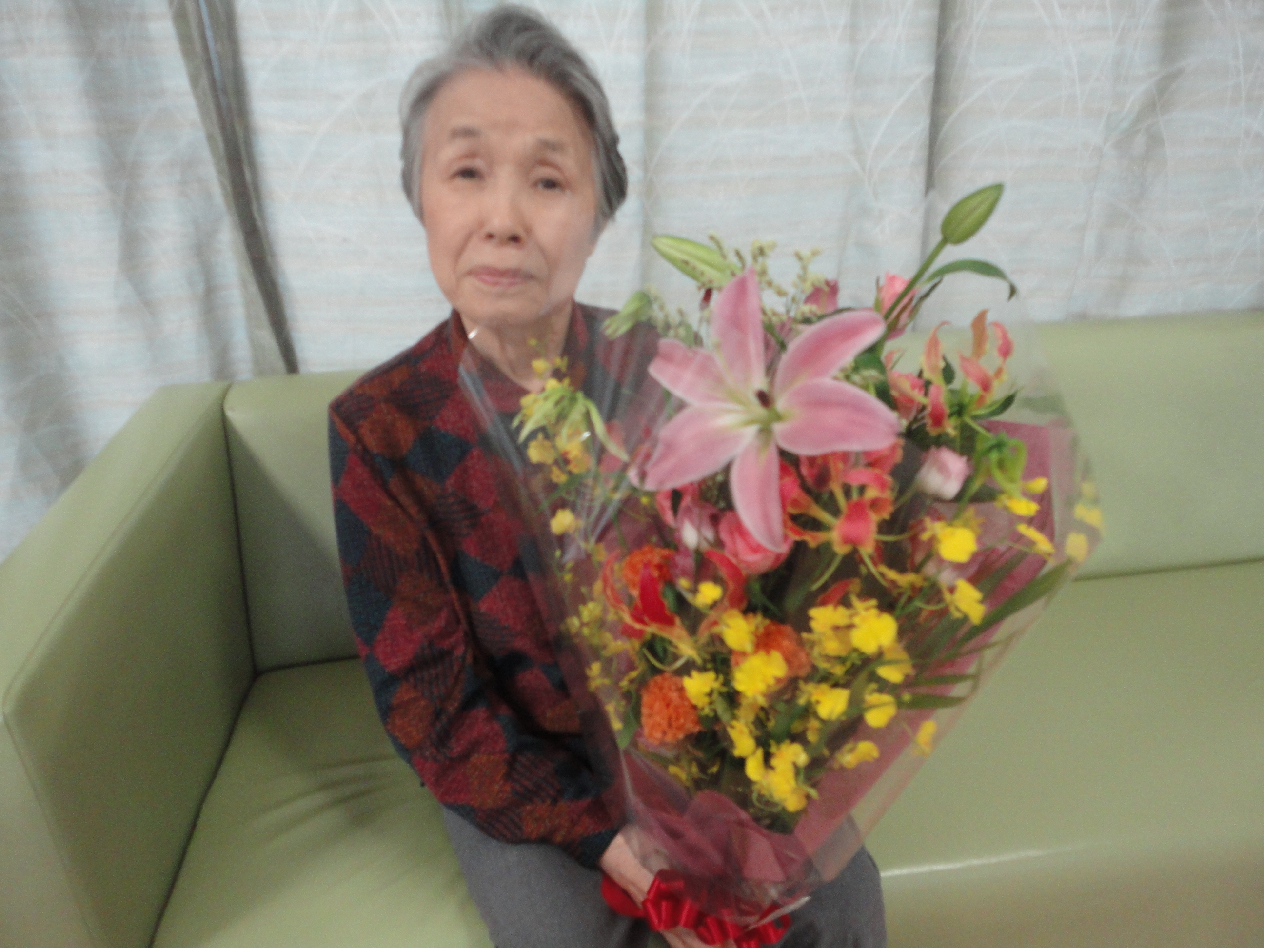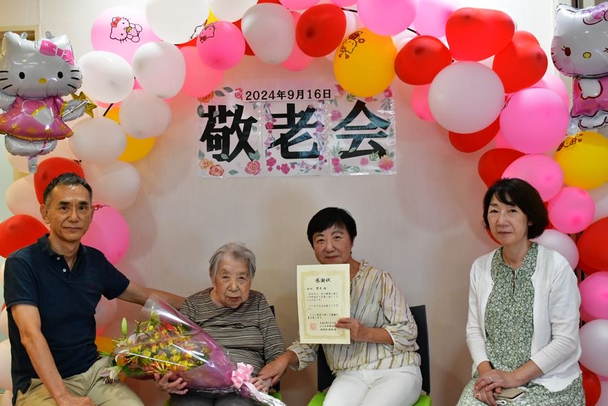 ご長寿を祝いまして、記念の賞状と花束を贈呈させて頂いて
